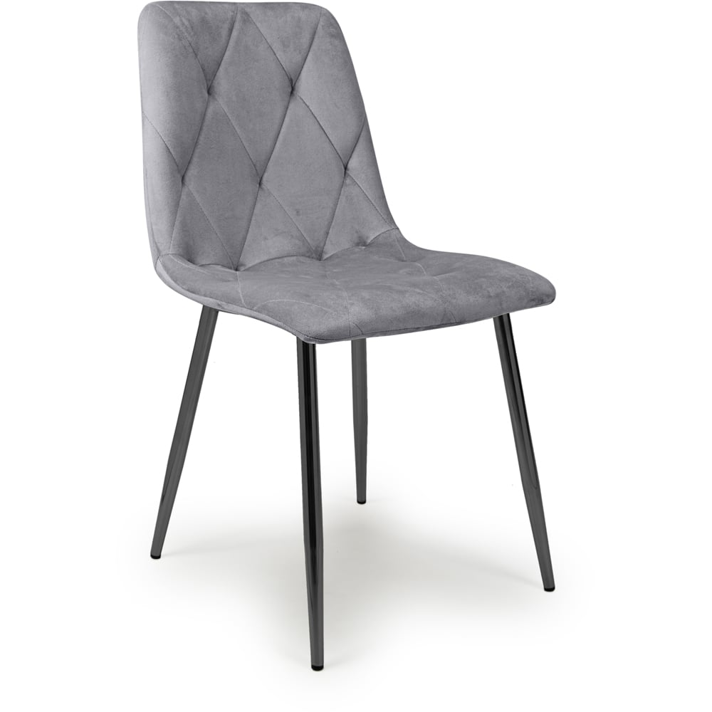 Introduce some contemporary elegance to your dining area with the Vernon Grey Brushed Velvet Dining Chair. This gently sloping dining chair is upholstered in a sleek grey brushed velvet fabric and features eye-catching diamond panel pleated stitching on its comfortably contoured seat and back. Supported by cross-frame black metal legs, these chairs require assembly and are supplied in sets of four. The grey brushed velvet upholstery, coupled with the diamond panel detailing, provides a sophisticated and luxurious aesthetic, whilst the contoured seat and back ensure a comfortable dining experience.