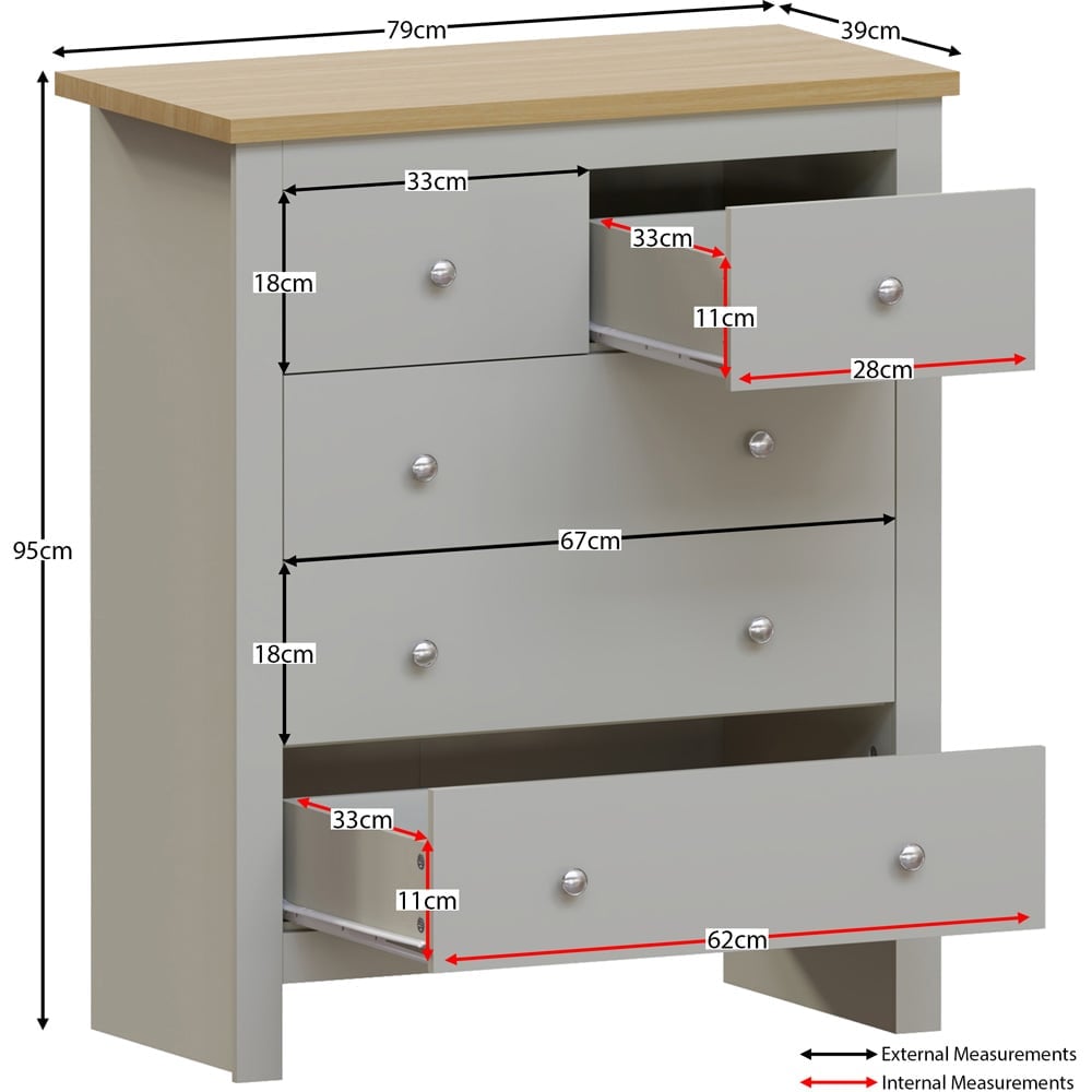 The Vida Designs Arlington 3 + 2 Drawer Grey Storage Chest is the ideal blend of practicality and elegance for your home. This chest of drawers features three large and two smaller drawers, offering ample storage to keep your belongings organised and easily accessible. From clothing and linens to personal items, this chest provides a dedicated space for all your essentials. Its classic Shaker style showcases clean lines and minimalist details, adding a touch of sophistication to any room, making it a versatile addition to various interior styles. Crafted with precision, this chest of drawers boasts a sturdy and reliable construction ensuring lasting durability, and a smooth wooden surface that exudes refinement, creating an inviting ambience in your living space.