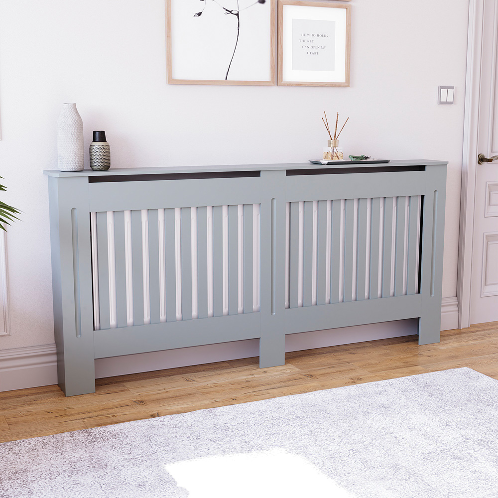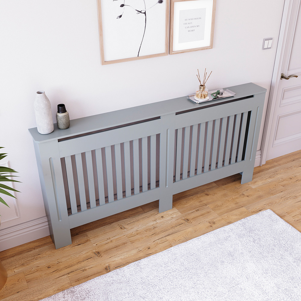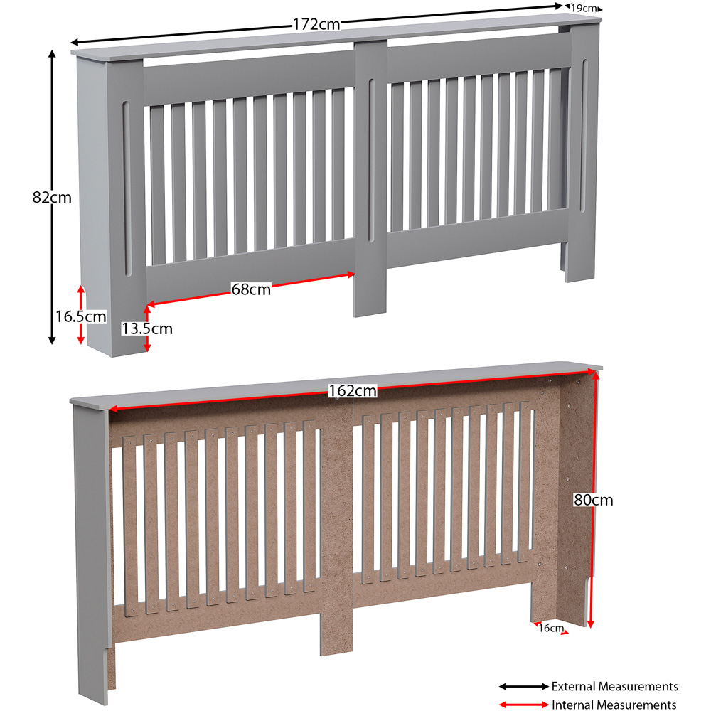 Enhance your home's style and warmth with the Chelsea Grey Extra Large Radiator Cover. Its clean vertical panel design complements any décor. Made from durable, powder-coated MDF, this cover offers lasting quality and efficient heat distribution. The spacious top surface (with a 5kg weight limit per shelf) provides a convenient display area for photos, plants, or decorative objects. Easy installation with included hardware ensures a quick setup. Protecting against accidental burns, it's ideal for families with children or pets. External dimensions: H82 x W172 x D19cm, Internal dimensions: H80 x W162 x D16cm. Please note: Colour may vary slightly depending on screen settings and home lighting. Measure your radiator at its widest points to ensure a proper fit (internal cover dimensions should exceed radiator dimensions.