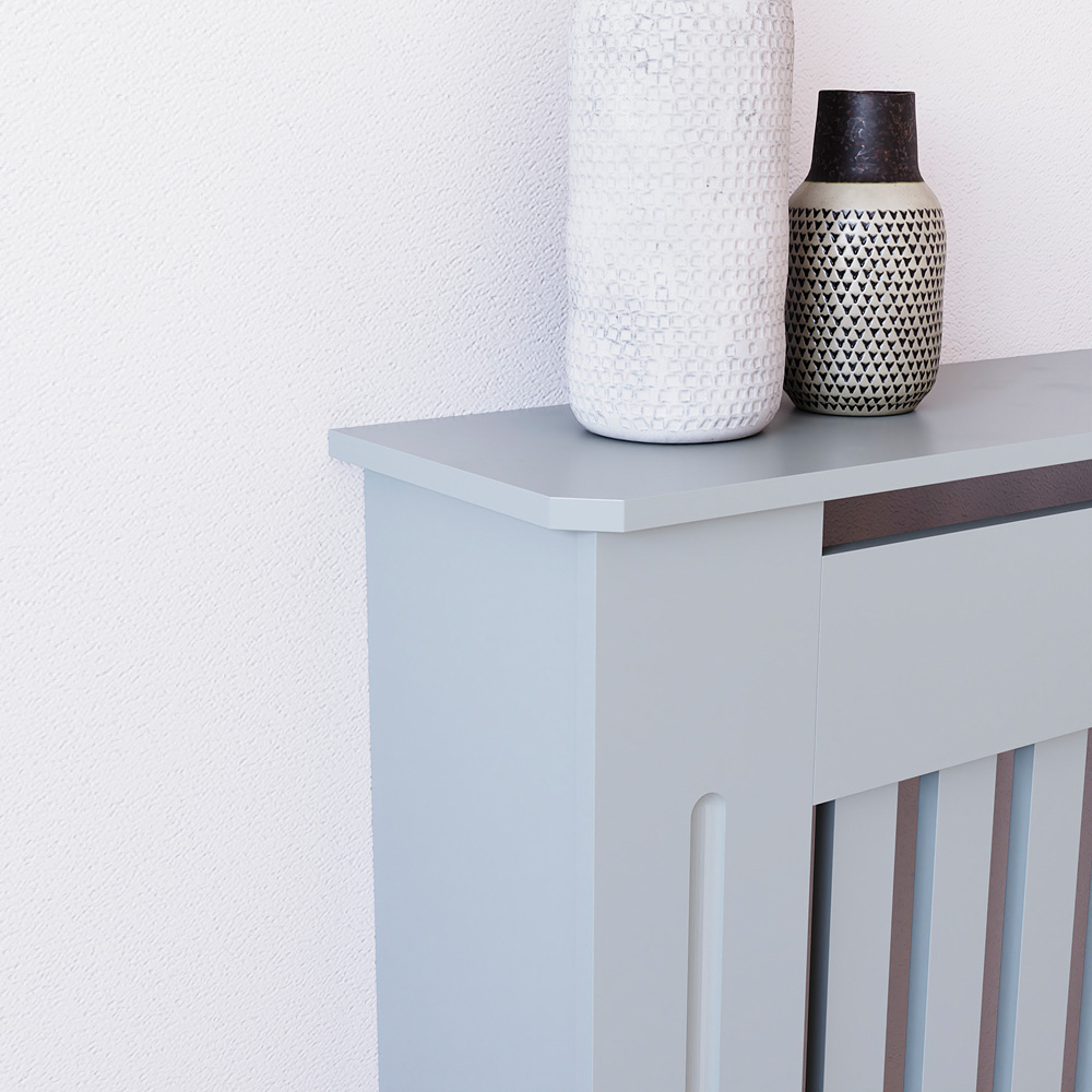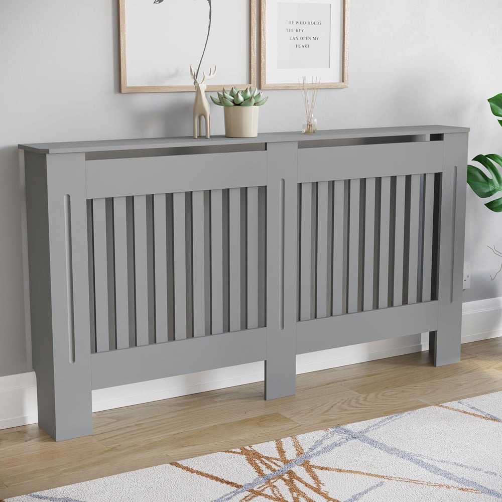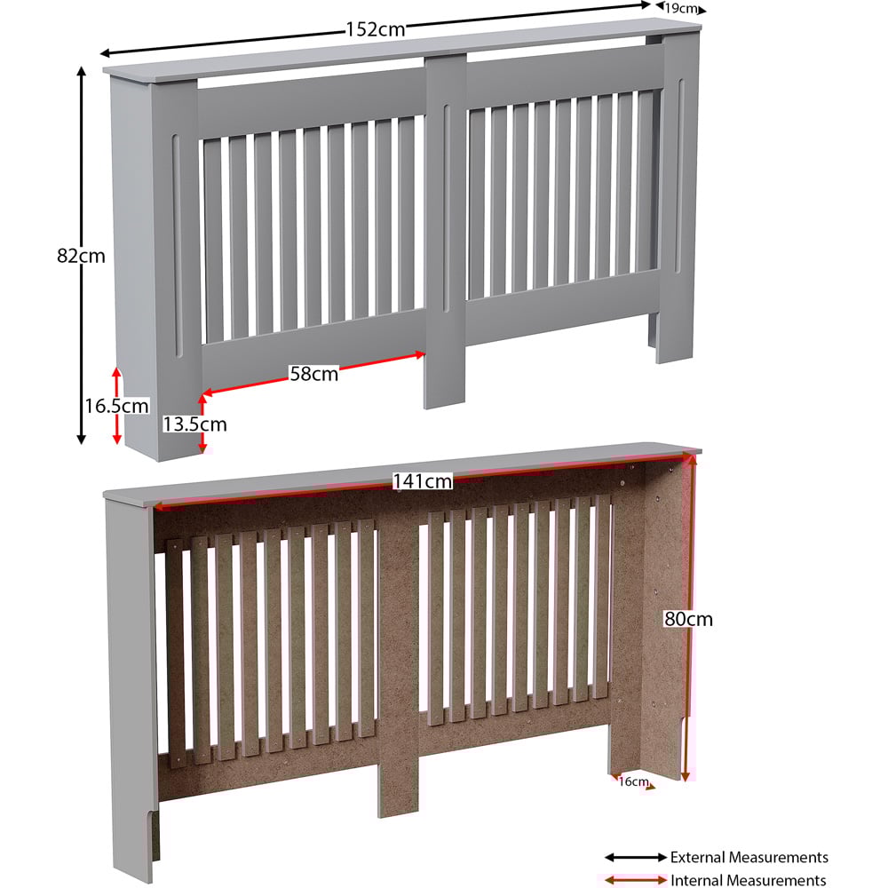 Enhance your home's style and warmth with the Chelsea Grey Large Radiator Cover. Its simple vertical panel design adds a touch of elegance to any room. Constructed from high-quality MDF with a durable powder-coated finish, this cover ensures lasting beauty and performance. Enjoy efficient heat distribution while creating a convenient display surface—perfect for showcasing photos, plants, or small decorative items (up to 5kg per shelf). Easy installation with included mounting hardware provides a quick and straightforward setup. Plus, it offers added safety, protecting against accidental burns. External dimensions: H82 x W152 x D19cm, Internal dimensions: H80 x W141 x D16cm. Please note: Colour may vary slightly depending on screen settings and home lighting. Measure your radiator carefully to ensure the cover's internal dimensions are slightly larger.