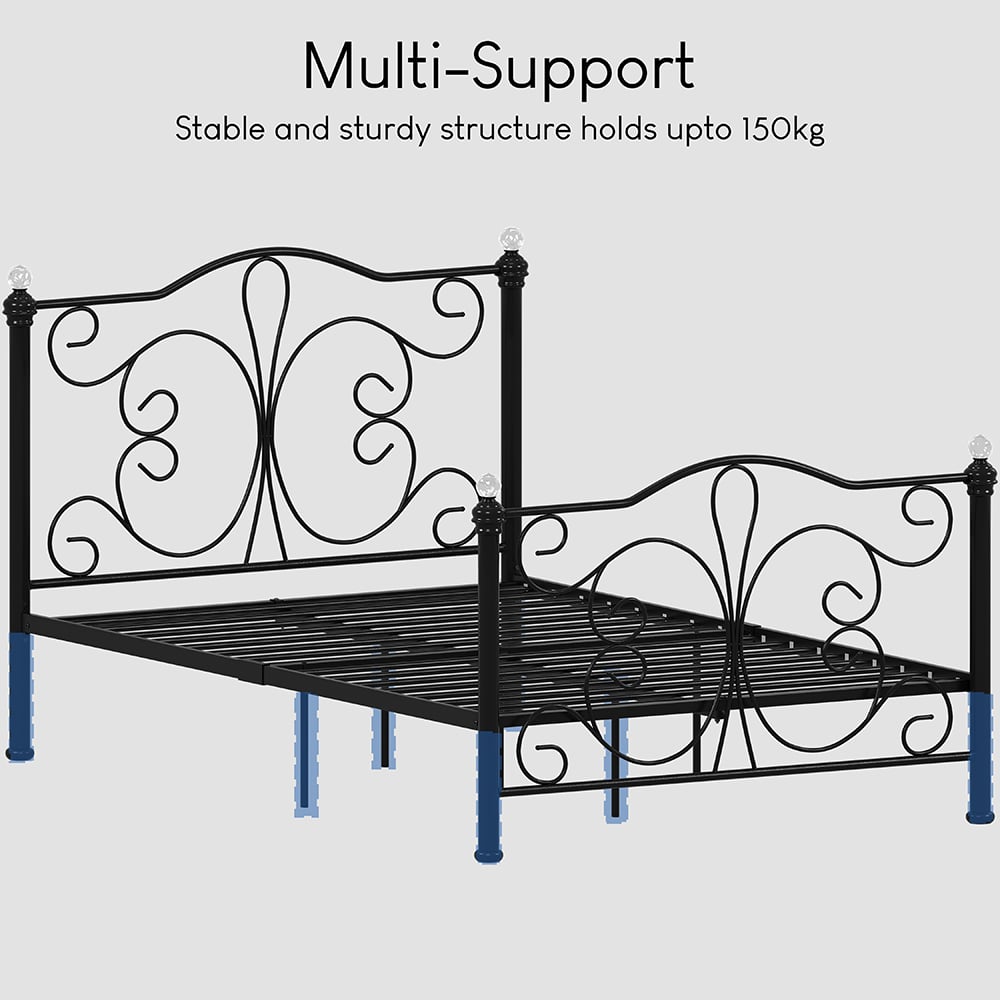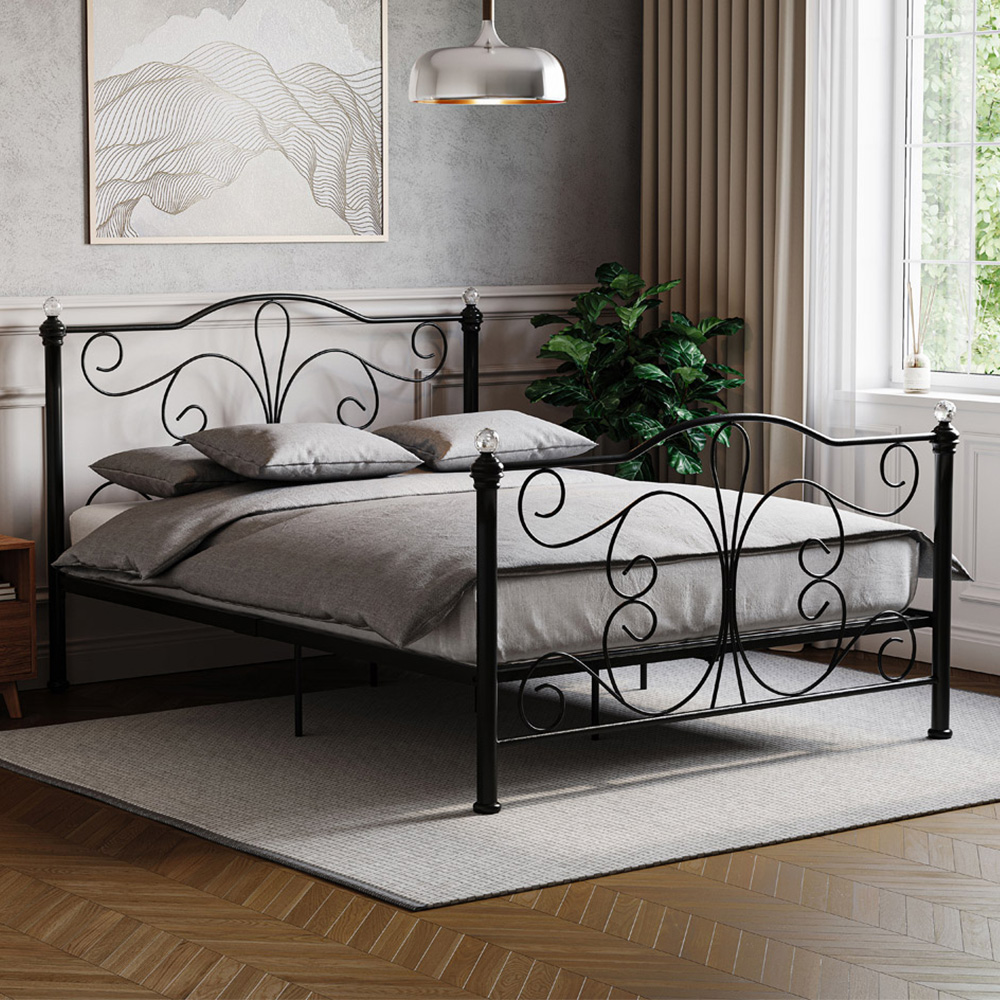 The Vida Designs Chicago King Size Black Metal Bed brings a touch of elegance to your bedroom. This bed frame features an open design, creating an airy and spacious feel that complements both modern and traditional décor. The design incorporates crystal finials on each corner, adding a luxurious touch. Designed for both style and practicality, it includes sturdy metal slats to provide excellent mattress support, ensuring a stable and comfortable sleep. The robust metal frame construction offers durability and long-lasting reliability, while the sleek metal materials introduce an element of industrial chic to suit various interior styles. Please note: Self-assembly is required, with easy-to-follow instructions included. The actual colour may vary slightly depending on your screen display and home lighting. Additional information: Placing this bed on a carpeted floor or rug is recommended. Movement on hard floors like wood, laminate, or tile can cause the frame to slip, potentially damaging components. The bed has a weight limit of 150kg.