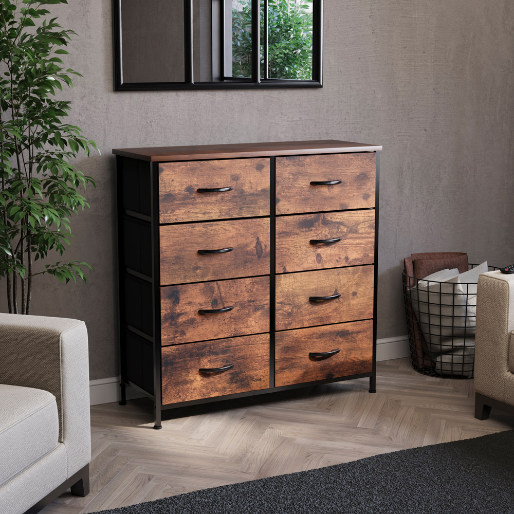 Elevate your space with Vida Designs Chorley Rustic Brown Fabric 8 Drawer Chest of Drawer . It is a lightweight yet sturdy storage solution, perfect for keeping your home organised. Designed with a durable metal frame and MDF top, this modern chest features 8 spacious fabric drawers, offering an ideal blend of practicality and style. Whether placed in a bedroom, living room, hallway, or office, its sleek and compact design ensures it fits seamlessly into any space while providing ample storage for clothing, accessories, or household essentials.