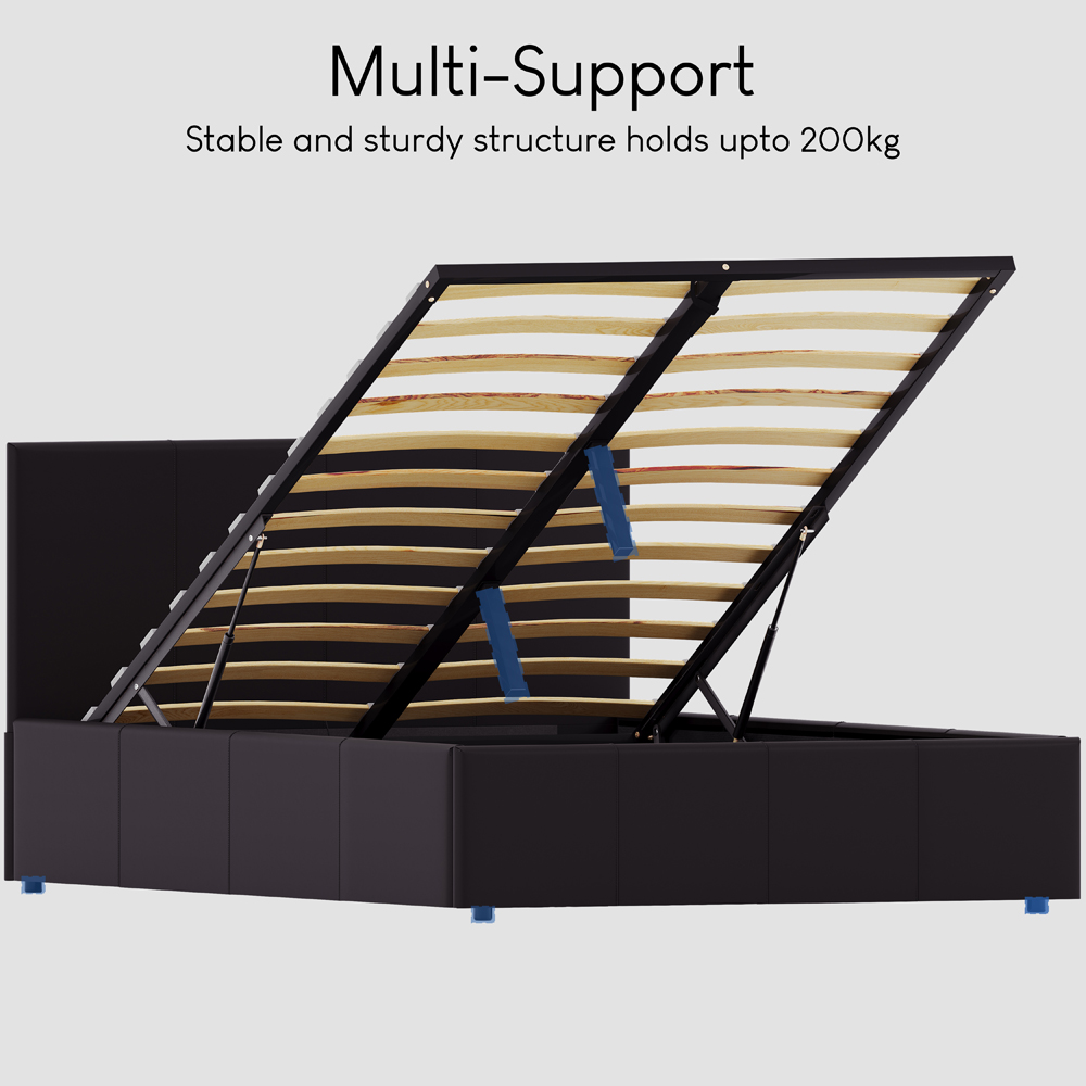 Beneath the surface lies a spacious ottoman storage area, easily accessed with a smooth, hydraulic lift mechanism. Keep your bedroom clutter-free by discreetly storing extra bedding and more. The slatted base provides excellent mattress support and ventilation, ensuring a comfortable and hygienic night's sleep.