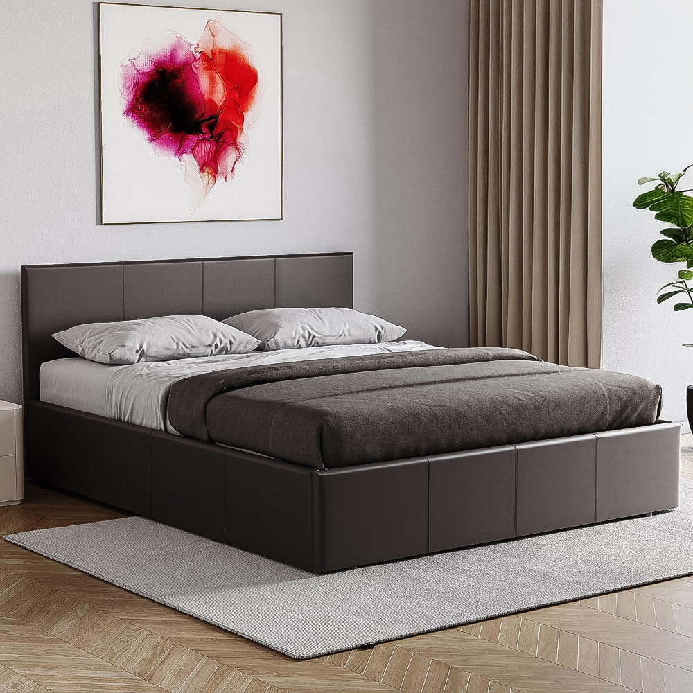 The Vida Designs Lisbon king-size ottoman bedstead combines practicality with elegance, creating a stunning focal point for any bedroom. Upholstered in luxurious faux leather with a rich brown finish, it brings a touch of sophistication to your sleep space, complementing a variety of interior styles. Beneath the surface lies a spacious storage solution, easily accessed via a smooth, hydraulic lift mechanism. This hidden compartment is ideal for stowing away extra bedding, clothing, or anything else you wish to keep neatly out of sight, helping maintain a clutter-free environment. The slatted base not only provides excellent mattress support and ventilation, enhancing your comfort and promoting a restful sleep, but also promotes airflow, ensuring a fresh and hygienic sleeping environment. Complete with a supportive, upholstered headboard, this sturdy and solid bed frame offers both style and substance, ensuring long-term stability and reliability. Please note, self-assembly is required, with straightforward instructions included. Colour shades may vary slightly depending on your monitor settings and home lighting. This bed has a weight limit of 200kg.