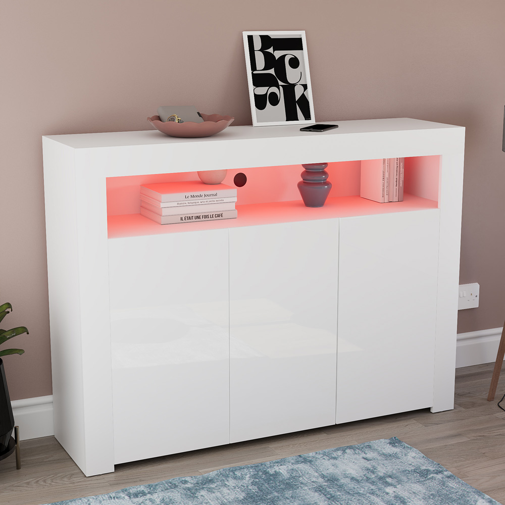 The high gloss doors and matte frame offer a visually striking contrast, lending a polished and stylish appearance. This combination of finishes adds depth and dimension, making it a focal point in your home. This is a white, three-door sideboard.