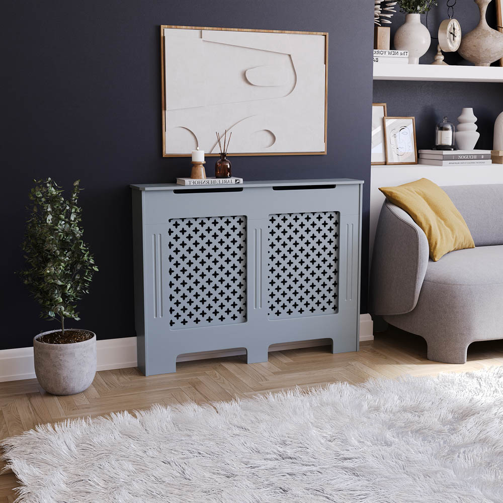 Conceal your radiator in style with the Vida Designs Oxford Dark Grey Radiator Cover. Expertly crafted from durable MDF with a sleek powder-coated finish, it maintains efficient heat circulation while discreetly covering exposed radiators. The striking star-shaped cutouts add a decorative flourish while ensuring warmth is evenly distributed. Its spacious top surface provides extra room for displaying décor, storing essentials, or adding a personal touch to your space. Prioritising safety, it acts as a protective barrier, keeping children and pets safe from hot surfaces. With the included wall mounting kit, you can secure it effortlessly for added stability and peace of mind. Size: Medium.