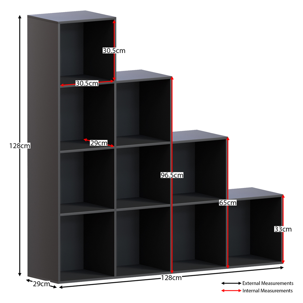 Elevate your home organisation with the Vida Durham 10 Black Cube Staircase Storage Unit. This ten-cube storage marvel, crafted from durable MDF wood, ensures lasting style and functionality. Its unique staircase design provides easy access to items stored in the upper levels, while the spacious cubes are ideal for books, toys, clothing, and other household items. Perfect for any room, from living room to bedroom, this unit is the key to effortless storage solutions.