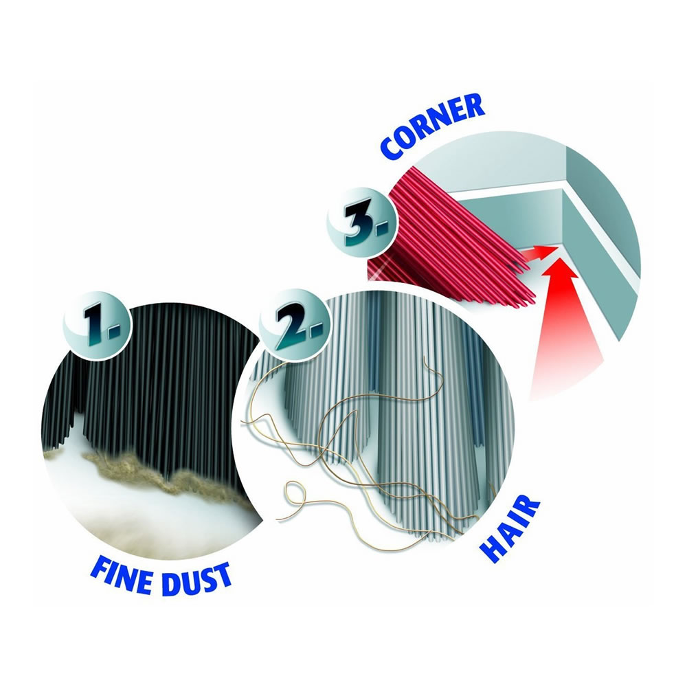 The Vileda 3Action Broom uses the very latest in broom technology to make cleaning around the home easier for you. The bristles in the broom head are positioned in a specially designed pattern to ensure dust and dirt are trapped in just one sweep. The broom has 3 main bristle actions: - Ultra-thin bristles for collecting fine dust - Rectangular tufts and fibres for maximum hair and particle pick-up - Angled hard bristles for cleaning into corners. The unique bristle formation effectively sweeps dirt and debris away on uneven floor surfaces. The rubber bumpers on the broom head ensure your furniture is protected. It's also both lightweight and easy to use to help you get through the cleaning chores quicker.
