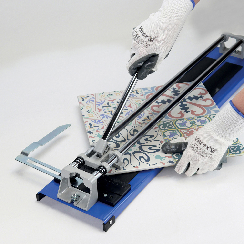 Effortlessly cut tiles with this Vitrex tile cutter. Its rigid steel construction and dual chrome-plated, heavy-duty steel rails ensure smooth scoring. A durable titanium-coated cutting wheel provides accurate and easy cuts, while the simple score-and-snap operation makes cutting quick and easy.