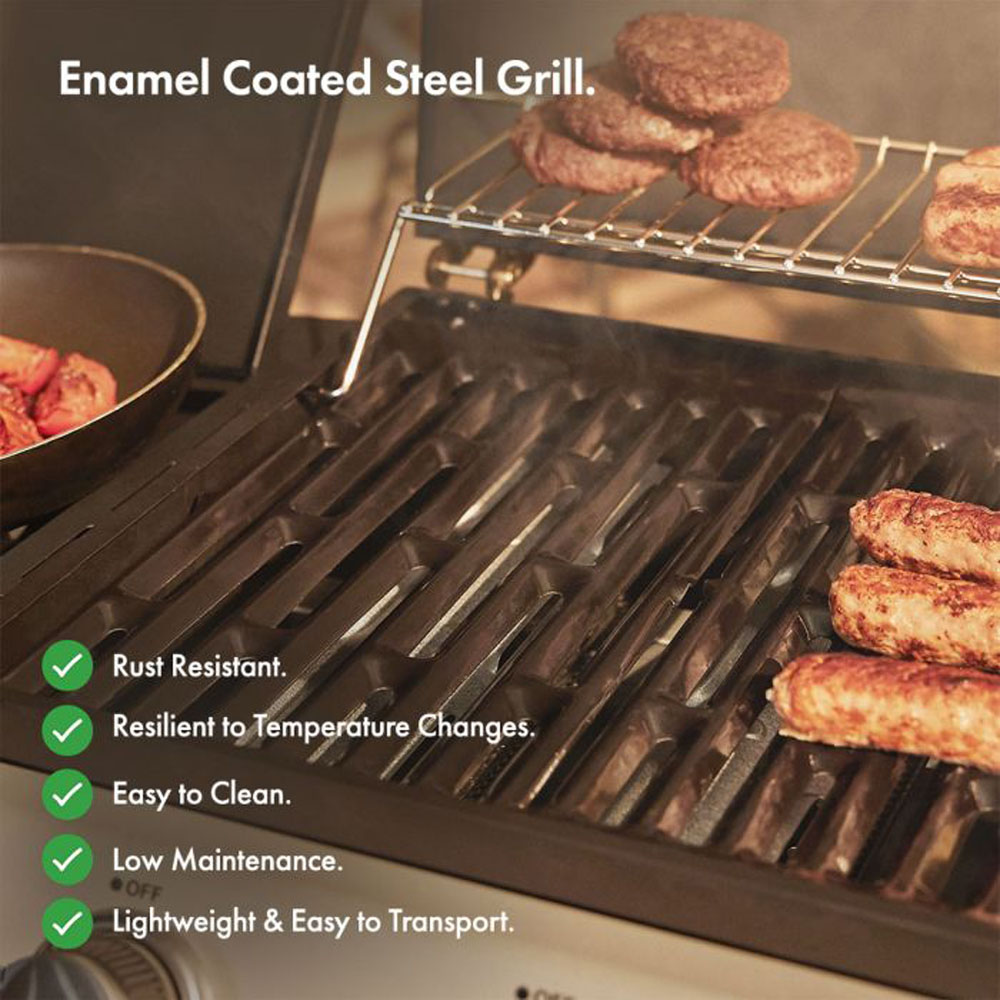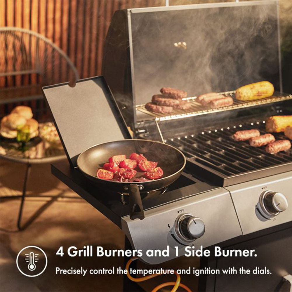 VonHaus 4+1 Burner Gas BBQ. Streamline your outdoor cooking with this simple, sturdy and sleek BBQ. Complete with a side table and large storage cupboard, maintain an organised grill station. Move with ease using the handle and two wheels, and effortlessly store away when not in use, ready for grilling season to return.
