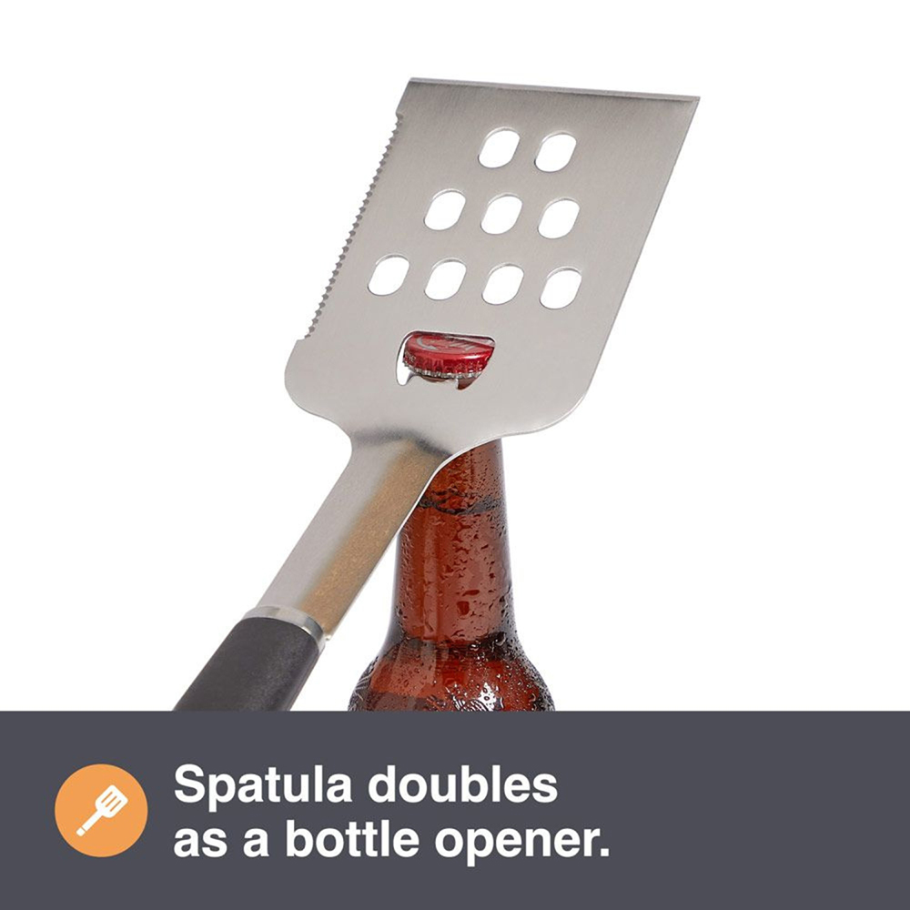• Includes tongs, fork, basting brush, turner, and cleaning brush