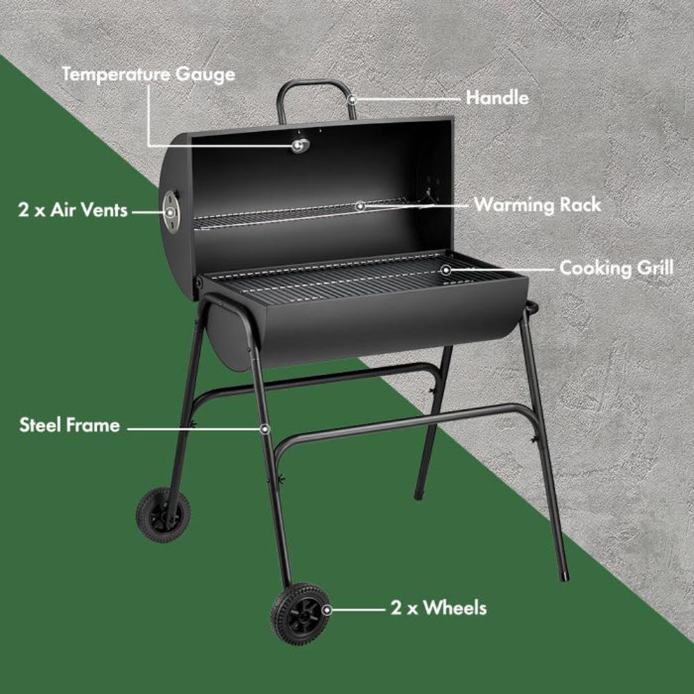 Unleash your inner grill master with this 2-in-1 drum barbecue, effortlessly transforming from a classic charcoal grill to a wood smoker with ease. Simply close off the ventilation and add wood chips for that authentic wood-fired flavour. Perfect for both BBQ beginners and seasoned pros, this barbecue makes catering for crowds a breeze. Monitor the temperature with the integrated on-lid gauge, fine-tune your cooking with the lift-up grill hatch, and ensure everything stays piping hot using the warming rack.