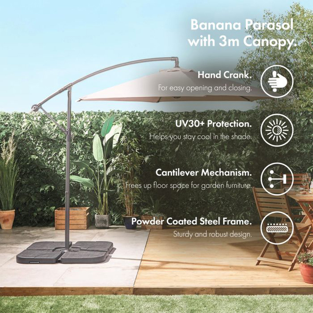 Bring flexible shade and stylish sun protection to your garden with this overhanging banana parasol. Featuring a generous 3m canopy and easy-to-use crank mechanism, it’s the perfect outdoor umbrella for creating a cool, comfortable space. For secure placement, weighted parasol segments are required. We recommend the VonHaus 2 Pack Banana Parasol Base (two sets are required to weight the parasol evenly – both sets not included).