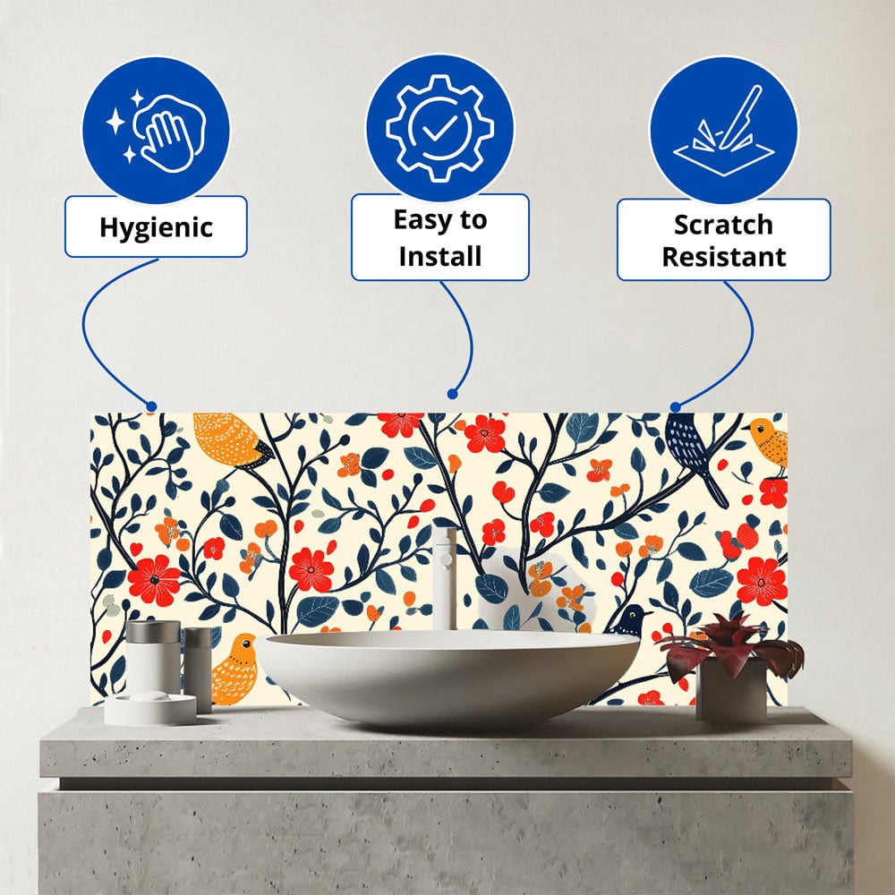 Warren Reed Designer Woodland Birds and Flowers In The Trees Glass Bathroom Splashback 25 x 60cm