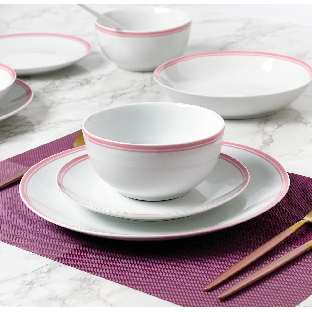 Elevate your dining experience with the Waterside St Ives Pink 16-Piece Dinner Set. A stylish and practical choice for everyday use or special occasions, this set offers a touch of sophistication. Including four 26.8cm dinner plates, four 19.2cm side plates, four 14cm deep bowls, and four 20.5cm pasta bowls, it's perfectly sized for any meal. Crafted from crisp white porcelain with an elegant pink double-band rim, this set adds a refined touch to your table. Conveniently, all pieces are dishwasher and microwave-safe for effortless cleaning and reheating.