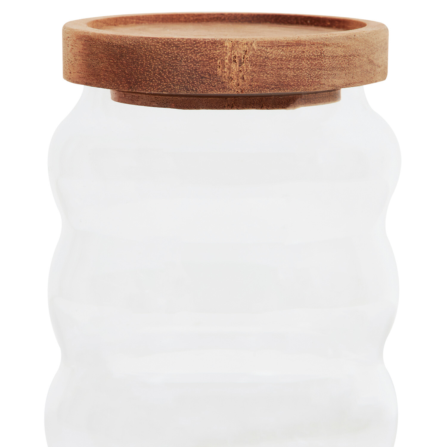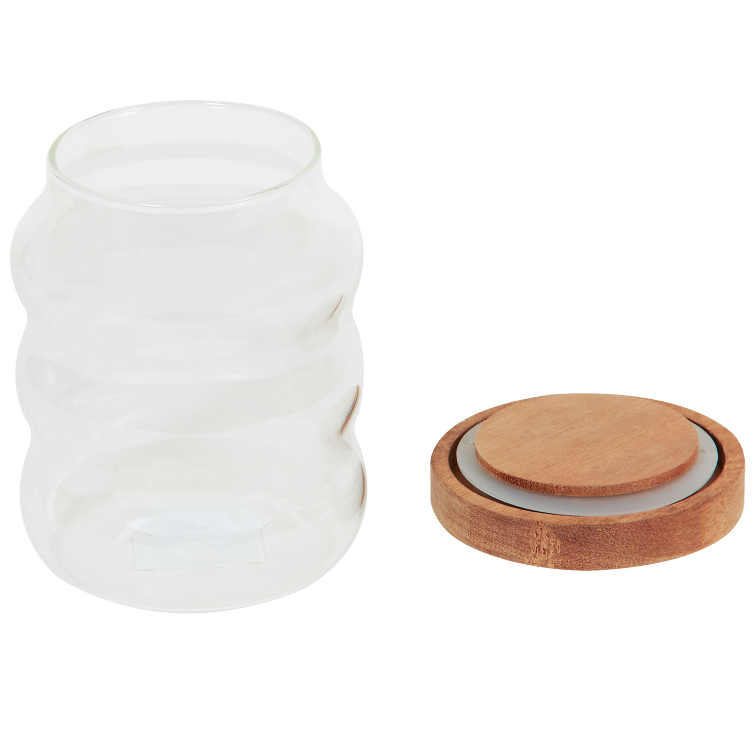 Introduce a stylish storage solution to your kitchen with this wave-shaped bubble jar. Designed with a transparent glass body and eye-catching bubble wave design, this jar allows you to easily view its contents while adding a touch of style to your space. Complete with a bamboo lid, it ensures your ingredients remain fresh and ready whenever you need them. It's the ultimate kitchen storage solution.