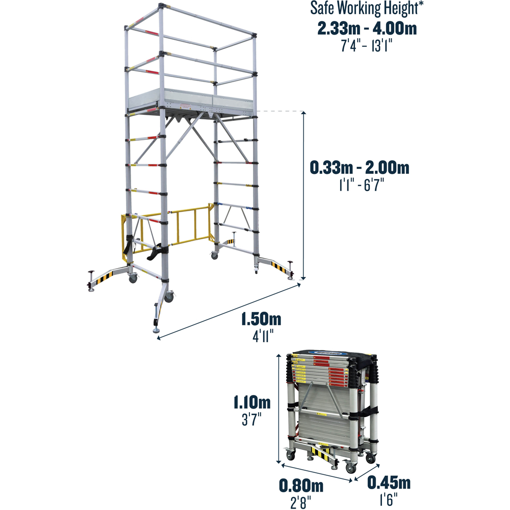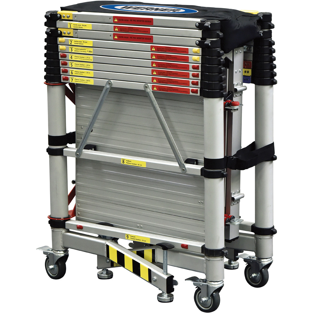 The Werner Telescopic Tower 2m is a versatile solution for various tasks, engineered for safe and efficient work at height. Its classic design incorporates an extendable and collapsible mechanism for quick and easy one-person assembly—fully erected in under three minutes. Adjustable to three podium heights, this sturdy tower, crafted from high-quality materials, features an integrated trapdoor for safe climbing and folds down to a compact size with integrated wheels for convenient portability.