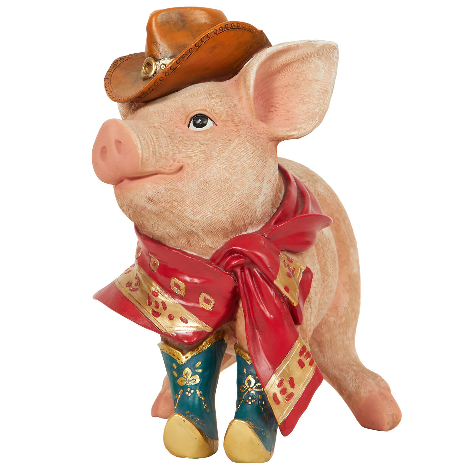 This charming Western Pig Decoration adds a touch of Wild West fun to your home or garden. Sporting a brown cowboy hat and a red scarf with gold detailing, this cheerful pig figurine stands tall, bringing a playful, distinctive accent to your décor.