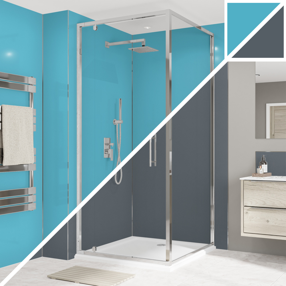Discover the elegance of this double-sided bathroom wall panel, featuring a vibrant Aqua/Cadet colour scheme in a gloss finish. Elevate your space effortlessly with the rich colours from the Splashwall Alloy Colour Range, designed to transform your bathroom into a sophisticated oasis.