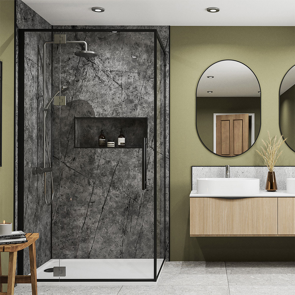 Elevate your bathroom's style with the Alloy Tempesta shower wall panel. Its dark grey base, accented with darker grey and black striations, mimics a striking stone effect. Perfect for a bold, modern look, this panel offers a stylish alternative to tiles, letting you craft the bathroom of your dreams. Part of the Wetwall Alloy Decor range.