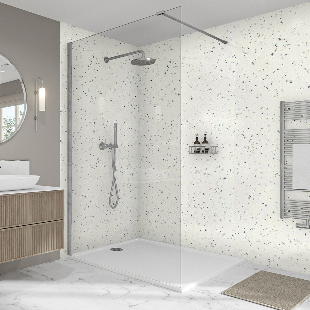 Quartzo Bianco: a timeless design featuring a crisp white gloss finish subtly accented with silver speckles. This elegant design offers a clean, sophisticated aesthetic with a touch of understated glamour.