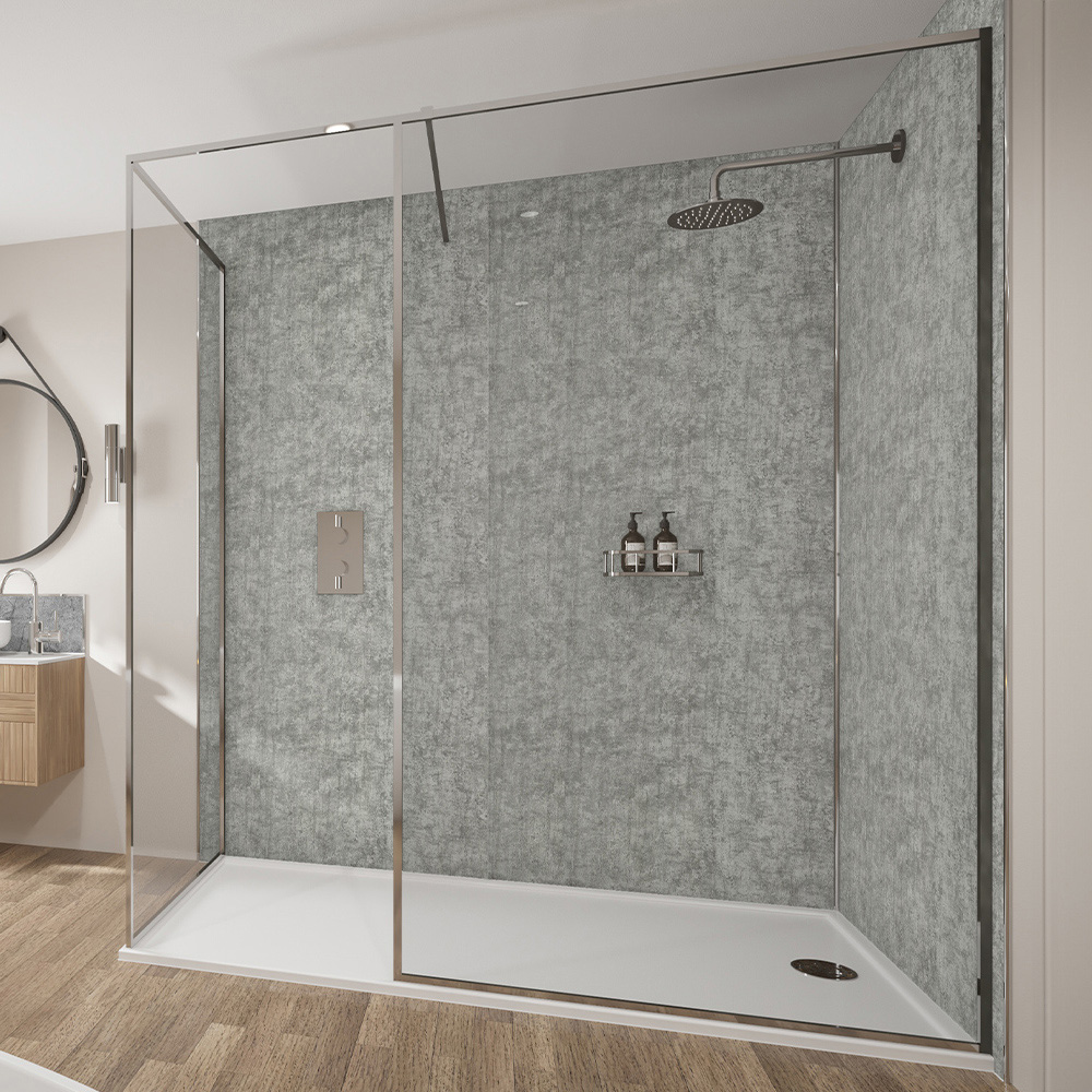 Make a statement with Platinum Stone. This striking wall cladding brings a contemporary concrete aesthetic to bathrooms and showers. Its deep grey tone, accented by natural stone markings, delivers a bold, modern look.