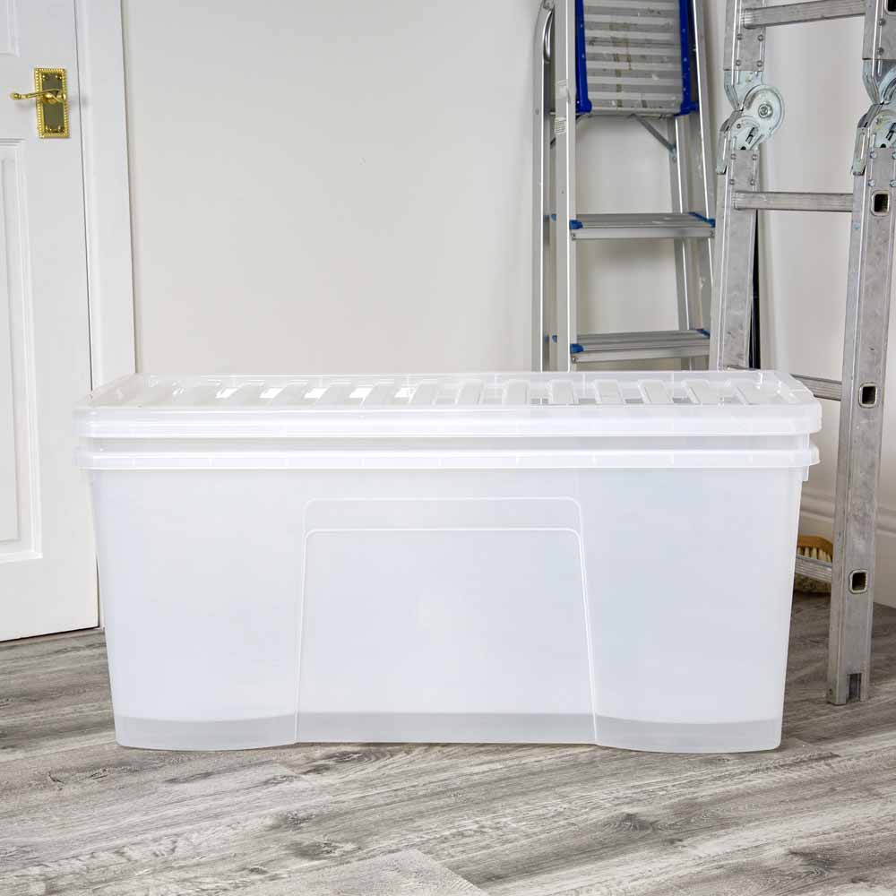 Declutter your space with this pair of 133L Crystal storage boxes. These generously sized boxes are perfect for storing a wide range of items, from clothing and bedding to paperwork and smaller items. Each box features a secure lid to keep contents safe and dust-free, and convenient side handles for easy lifting and moving. Save space with their efficient stackable design. Dimensions: L 99.00 x W 39.50 x H 42.50 cm.