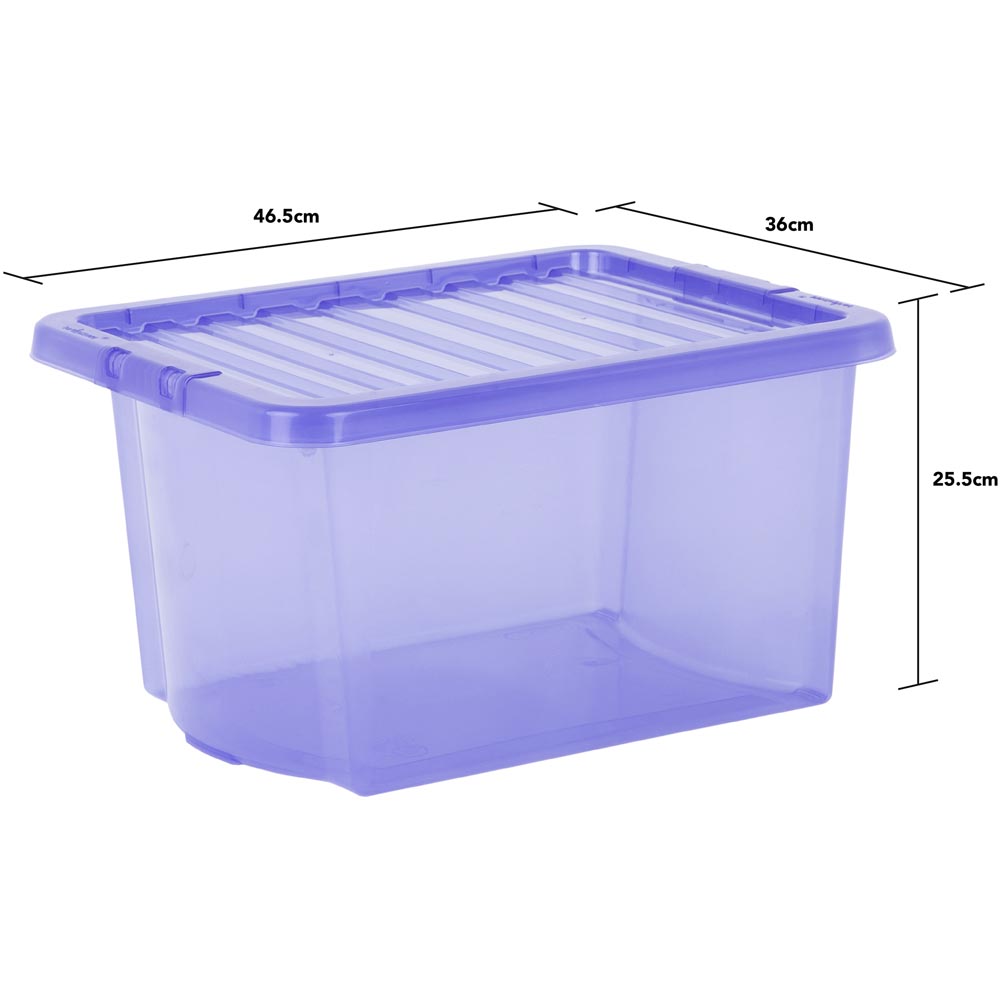 Five 28-litre storage boxes offer a versatile storage solution for home or office. Made in the UK from high-quality materials, these translucent boxes let you easily see what's inside. Ideal for storing a wide variety of items, from craft supplies and toiletries to pantry goods, cleaning products, stationery, or toys. These stackable boxes save space and nest for compact storage when not in use. Secure clip-on lids keep contents safe. Dimensions: 42.5 x 36 x 25.5cm.