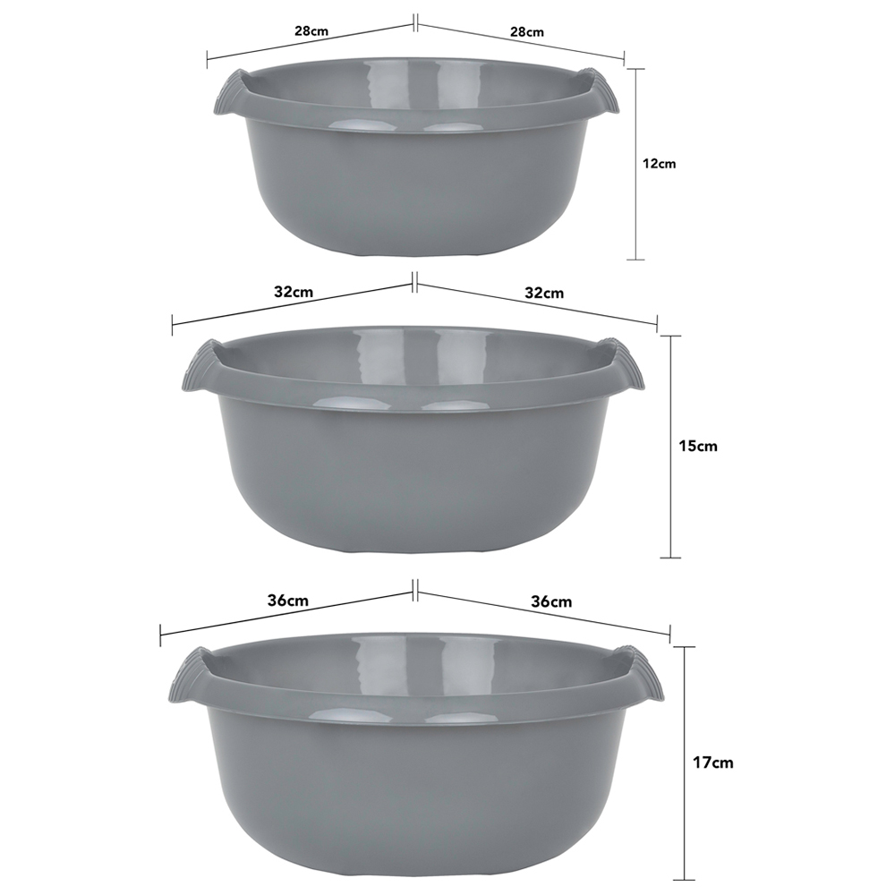 A versatile addition to any kitchen, this three-piece silver plastic bowl set offers both style and practicality. Its high-gloss finish and integrated handles make each bowl easy to use and maintain. The durable construction ensures longevity. Dimensions are generous: Small (12 x 28 x 28cm), Medium (15 x 32 x 32cm), and Large (17 x 36 x 36cm.)