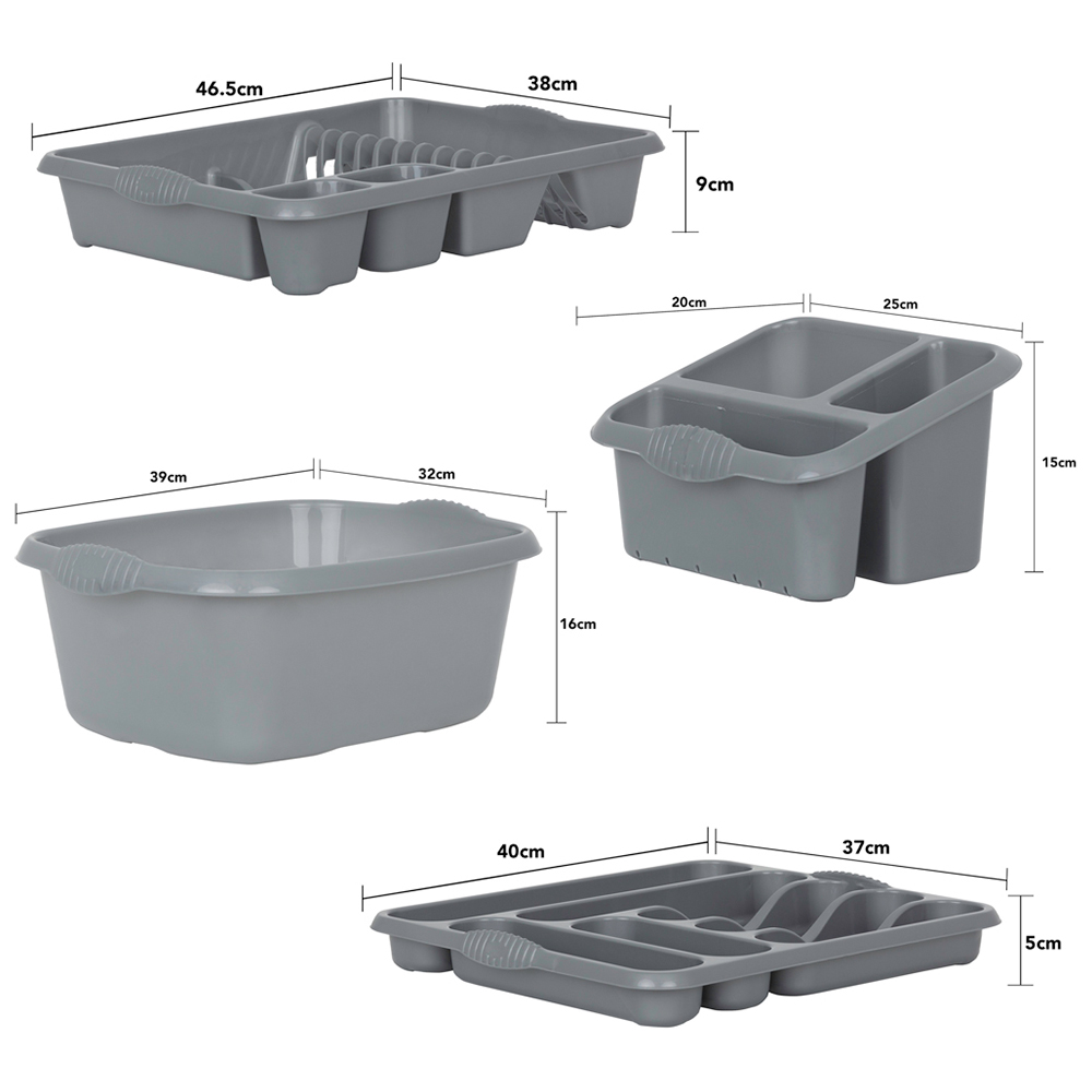 Tidy up your kitchen clutter with this four-piece Silver Casa Kitchen Set by Wham. This set includes a 38cm rectangular bowl, perfect for washing, a large cutlery tray to keep your forks, knives, spoons and accessories separate and neatly stored in your drawer, a large dish drainer that makes draining and drying your crockery and utensils a doddle, and a sink tidy that's just the thing for keeping your washing-up items neat and organised.