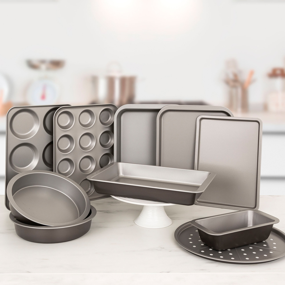 Crafted right here in the UK, the Baker & Salt 10-piece bakeware set is built to deliver fantastic results time after time. Whether you're roasting a Sunday lunch, baking a cake for a birthday party, or whipping up some cupcakes for the school fair, this set has got you covered. It includes a 41cm roaster (41 x 31.5 x 7 cm), two 41cm baking trays (41 x 32 x 2.5cm), a 33 x 33 x 1.5cm pizza tray, a 36 x 25 x 1.5cm Yorkshire pudding tray, a 32 x 23.5 x 1cm Swiss roll tray, a 35.5 x 27 x 3cm 12-cup cupcake tin, a 27.5 x 13.5 x 8.5cm 4lb loaf tin, and two 23cm deep sandwich tins (23 x 23 x 5cm). Each piece features a double non-stick coating for effortless food release and easy cleaning. Oven-safe up to 230 degrees C, this set is also freezer and dishwasher-safe for added convenience.