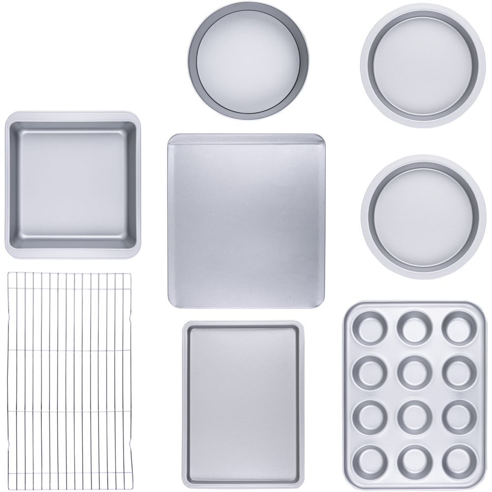 Elevate your baking game with the Wham Baker & Salt 8-Piece Beginner Baking Set. Finished in silver, this premium quality collection boasts a double non-stick coating, ensuring cakes release effortlessly. A splendid gift for aspiring bakers, the set contains all the essential tools and tips to embark on your baking journey. Comprising high-quality steel with a robust, easy-release non-stick coating, each piece promises reliable performance. A durable steel cooling rack is also included, catering to a range of baking requirements and meeting various baking needs.