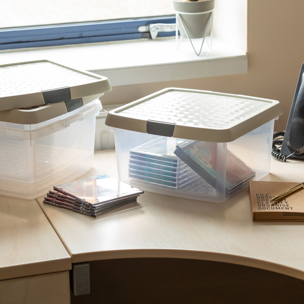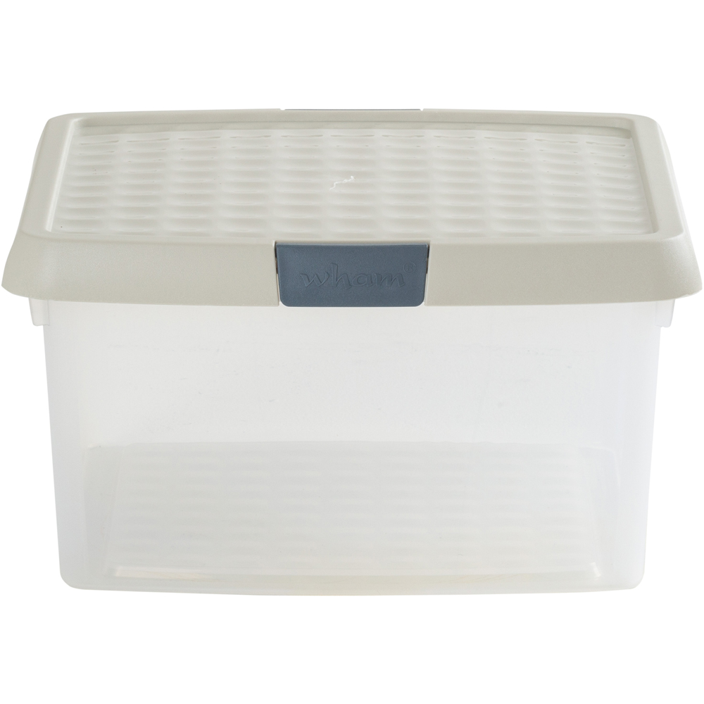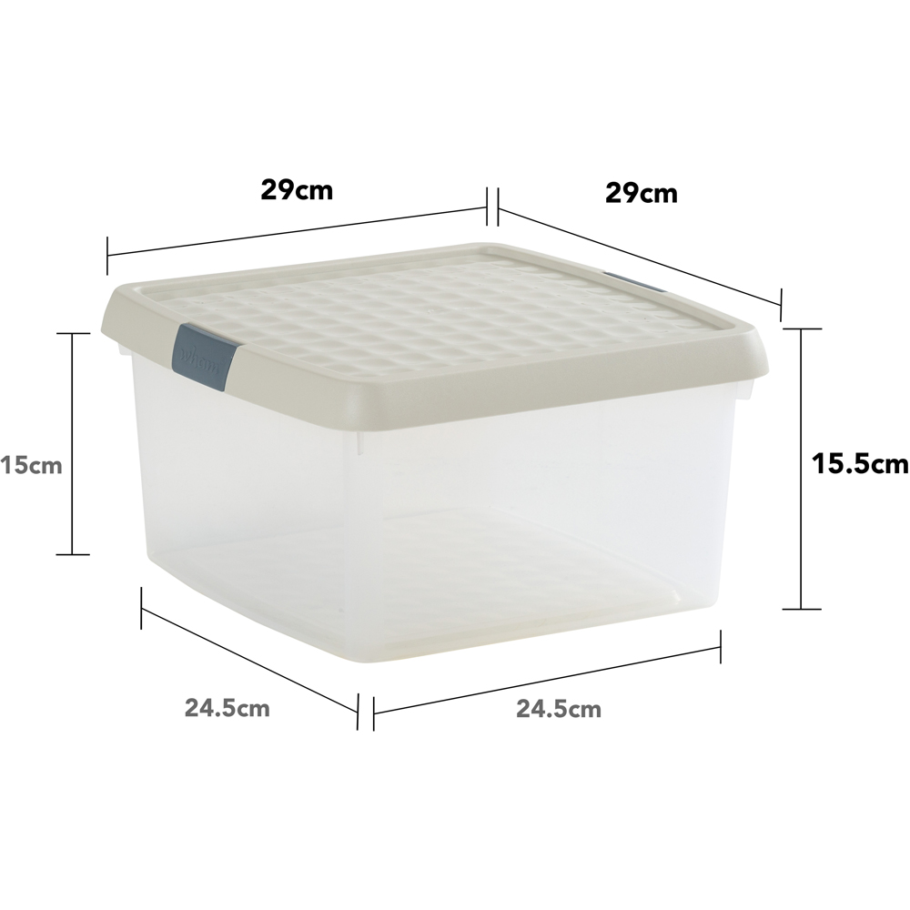 Declutter and organise any room in your home or workplace with the Wham Clip 9L Clear Stone and Slate Grey Square Storage Box with Lid 3 Pack, a space-saving solution. The clear base lets you easily see what’s inside, making it ideal for sorting and storing items such as toys, clothes, household textiles, bedlinen, photographs, travel keepsakes, and crafting supplies.