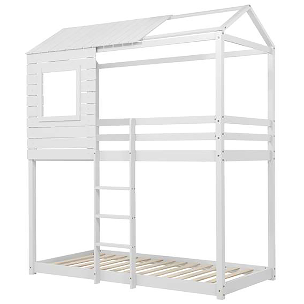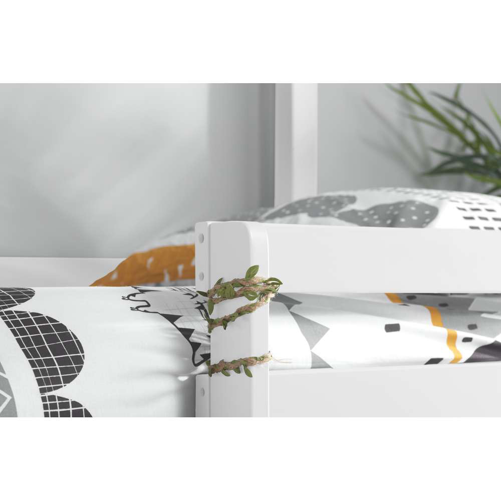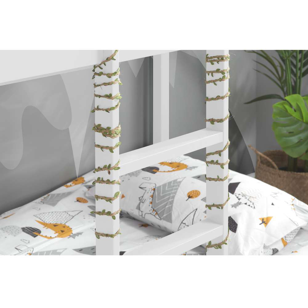 Create the ultimate bedroom hideaway with the White Adventure Bunk Bed. Its playful yet stylish design, featuring country-style cladding and a traditional pitched roof, offers a cosy shelter perfect for children. Ideal for siblings, the lower bunk sits low to the ground for added safety, especially for younger children. The sturdy frame includes a solid slatted base for firm support and excellent mattress airflow. Please note: the maximum weight capacity is 80kg, and the bed is designed to accommodate a UK standard size mattress.