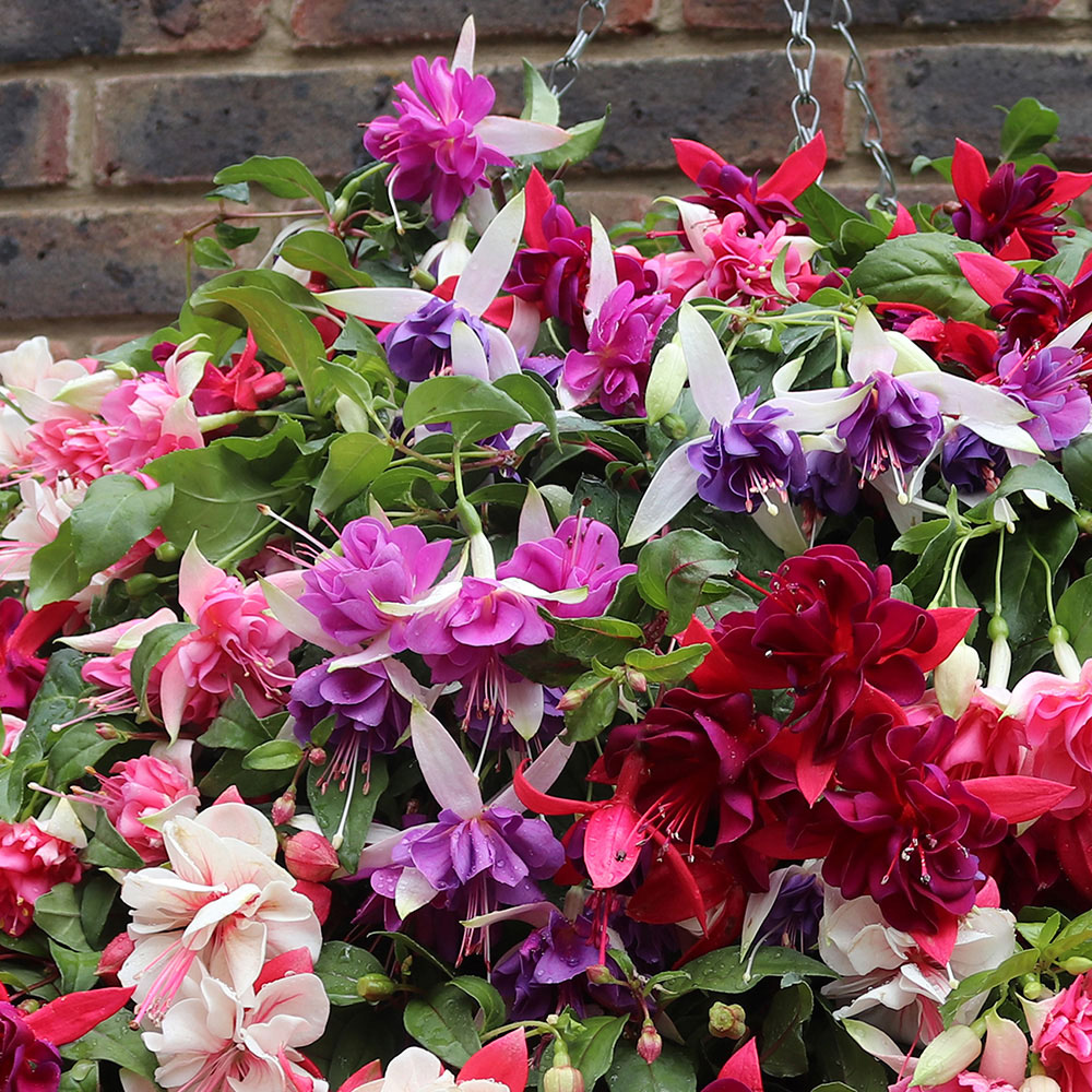 Create a vibrant summer display with this 12-pack of jumbo fuchsia plug plants. This collection features three of each of four stunning varieties: the dramatic 'Voodoo' with deep purple ruffled centres and striking red sepals; the cheerful red and white 'Swingtime'; the playful deep pink 'Bella Rosella'; and the rich magenta-tinged 'Deep Purple'. These exceptional fuchsias are renowned for their impressive bloom size and long-lasting summer colour. Perfect for cascading over baskets, their colourful blooms will provide a breathtaking spectacle. Each pack contains 12 plug plants, ready to grow on before planting out, ensuring a bountiful summer display.