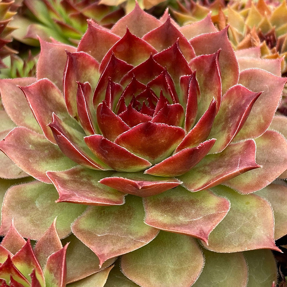 Bring a touch of the extraordinary to your garden with our Sempervivum Chick Charm Giants Plant Pots. These easy-care succulents, also known as houseleeks, create stunning visual interest with their unique rosettes of fleshy leaves. This collection includes three 12cm pots: Giants Copper Canyon, Giants Emerald Explosion, and Giants Gold Mine. Giants Copper Canyon shows copper-red edges framing a jade centre in spring, deepening to ruby at the edges as the year progresses. Giants Emerald Explosion boasts vibrant emerald green edges against burgundy leaves, maintaining its striking colour year-round. Giants Gold Mine offers a captivating blend of shiny gold and dark maroon-red, consistent throughout all seasons. These low-growing plants thrive in full sun and well-drained soil, tolerating drought once established. They grow to 10cm tall and 25cm wide. Plant from March to November. Note: Plant height varies seasonally; images are for illustration only. All heights include the pot.