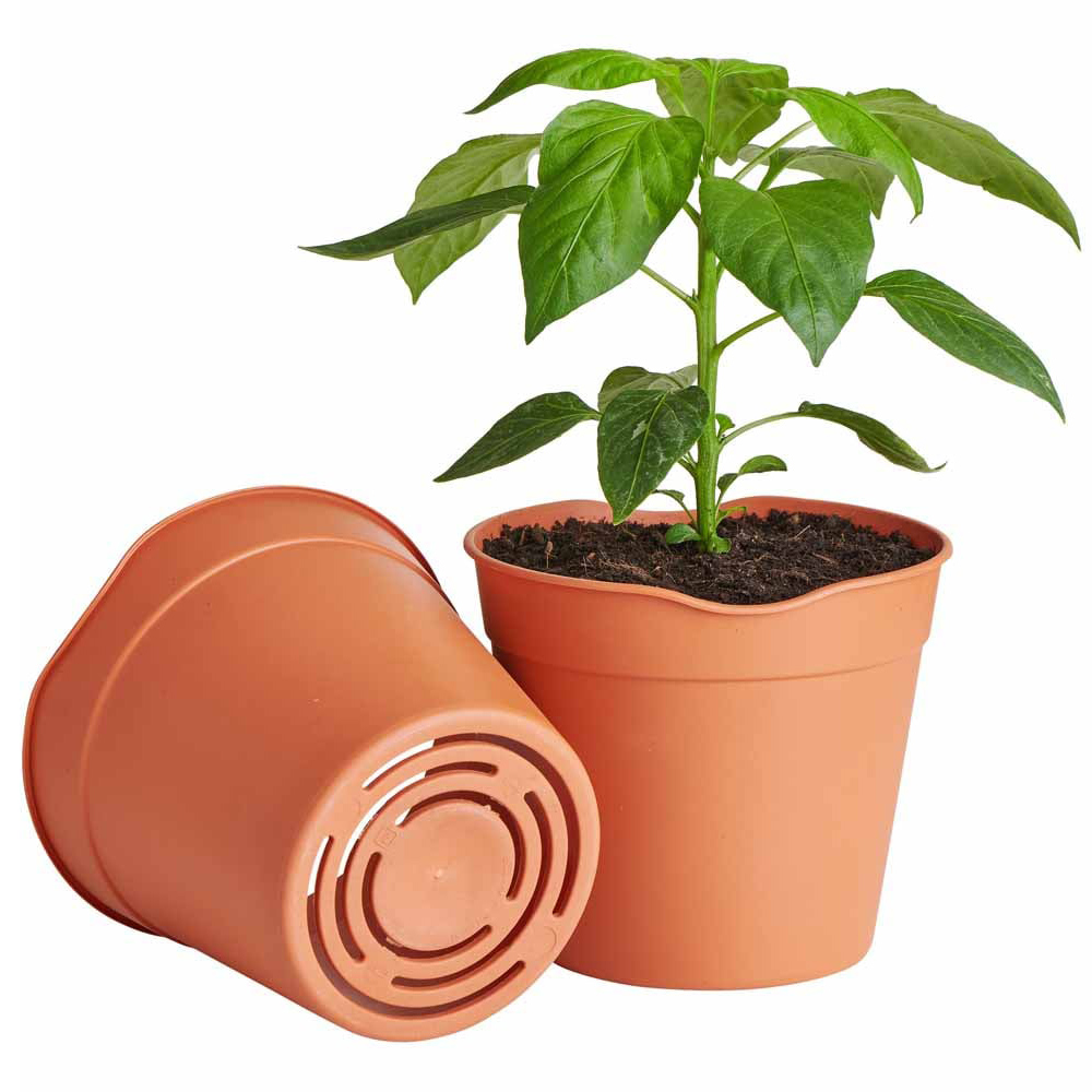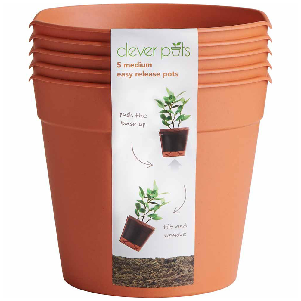 Nurture your seedlings and young plants with the Clever Pots Medium Easy Release Propagation Pots, designed to encourage healthy growth. This set contains five medium-sized plant pots presented in a timeless terracotta colourway. Thanks to the innovative push-up, easy-release base, plants can be removed swiftly and effortlessly for repotting, minimising root disturbance. The simple three-step removal process allows for easy plant release – just push the base up, tilt, and remove. The textured surface is designed for labelling with pencil or dry marker, making identification easy, and can be rubbed clean for re-use. Crafted from 20% recycled flexible plastic, these pots are less prone to splitting and cracking, and designed for repeated use across multiple seasons. They can also be recycled at the end of their lifespan. Complete your Easy Release Pots with perfectly fitting saucers, available separately. These clever saucers catch excess water during watering and store it for later use, helping to keep your plants hydrated for longer. Dimensions: D 10.4 x W 12 x H 10.5cm. Dia: 12cm. Material: PP - Polypropylene.