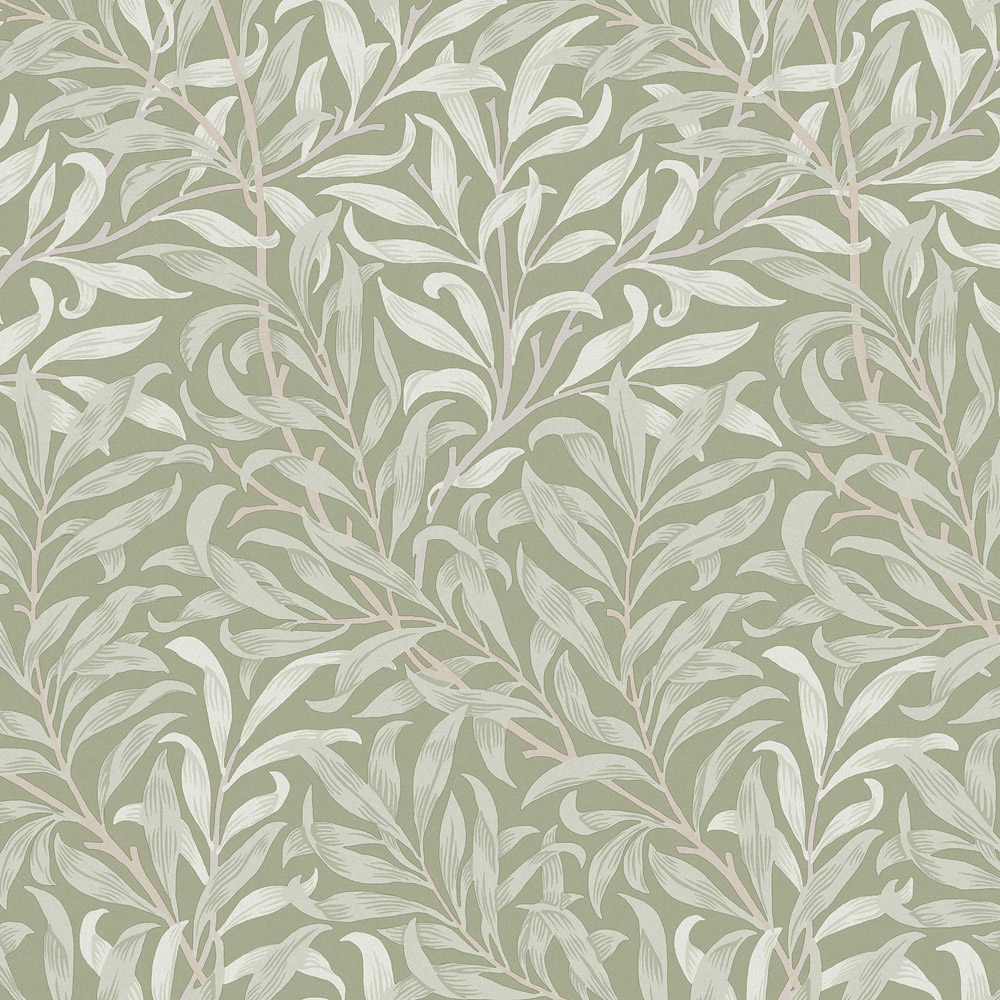 A design classic, Willow Bough Sage brings a touch of timeless elegance to your home. Originally conceived by William Morris in 1887 as a wallpaper, and later adapted for fabric in 1895, this design showcases a diagonal branch pattern reminiscent of Morris's beloved willow form. The soft off-white, light grey, and sage leaves trail across a muted light olive background, creating a calm and quaint feel. Part of The Gallery's collection, featuring earlier printed chintz and wallpaper designs, this matt finish wallpaper evokes the outdoors with a gentle, abstract charm. Block printed at Merton Abbey, it's a beautiful addition to any room.