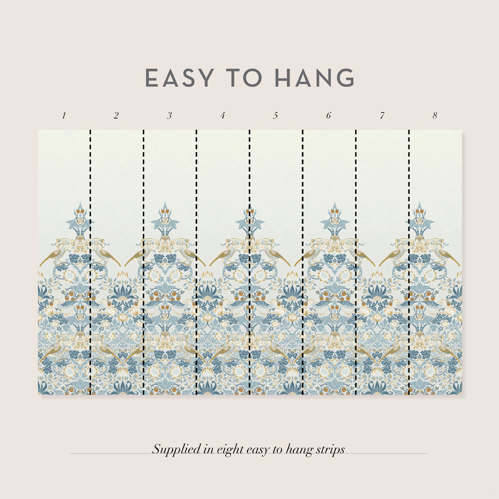 Inspired by the Oxfordshire garden of Kelmscott Manor, Strawberry Thief is perhaps William Morris's most recognisable design. Legend has it that Morris was motivated to create the design by watching thrushes steal strawberries from under his nets. Originally printed using hand-carved woodblocks to build up the different colours, the intricate pattern made 'Strawberry Thief' one of the most costly cottons produced by Morris's firm. The design, which caused Morris many sleepless nights in his lodgings at Merton Abbey, was first conceived in 1883 and has remained an iconic and beloved design ever since. This Strawberry Thief Soft Blue mural offers an artist's interpretation of Morris's classic, blending mustard yellow with a variety of soft blue tones against a gentle white backdrop. The mural's lighter palette and matt substrate finish lend a delicate complexity, ensuring it will enhance any room. This mural is available in a 4 x 2.5 metre size.