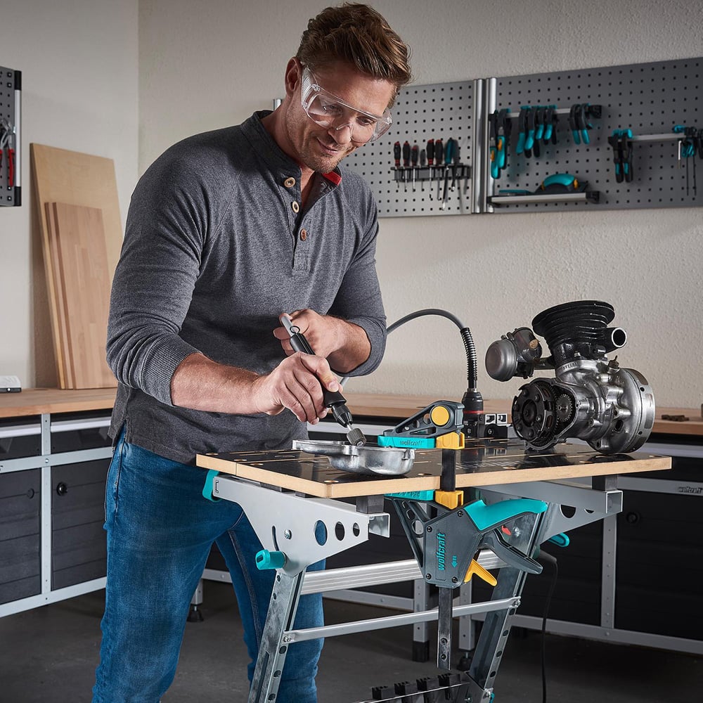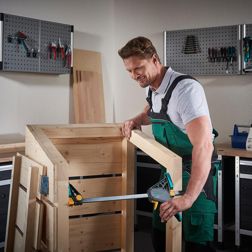 Experience powerful, precise clamping with just one hand using the Wolfcraft EHZ PRO One-Hand Clamp (100 or 300mm), a professional-grade tool designed for speed, strength, and convenience. With a clamping force of up to 120kg, this clamp features a high-quality hardened steel rail for long-lasting performance and consistent pressure. Its large, rubberised clamping surfaces protect delicate or painted materials while ensuring even pressure distribution. The ergonomic handle with a non-slip grip allows for safe, comfortable operation, and the intelligent mechanism enables quick clamping and release with a single hand. Easily switch to spreading mode at the push of a button, and use the adjustable spacing guides for precise positioning when glueing or assembling furniture. With a generous 100mm throat depth and a cross groove for securely holding round objects, this clamp is versatile and essential for any serious workshop.