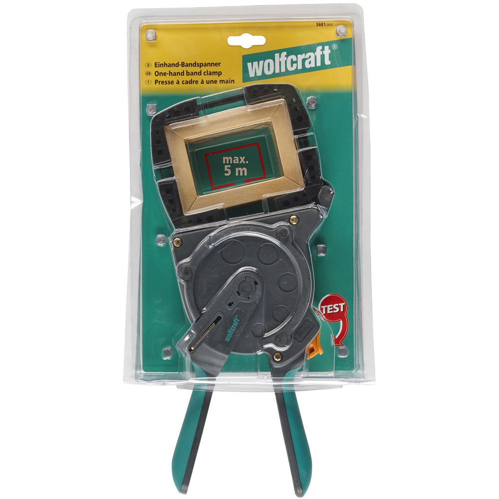 Secure rectangular workpiece quickly and effortlessly with the Wolfcraft One-Hand Frame Clamp, designed for fast, one-handed operation. Ideal for assembling frames, boxes, or furniture, this clamp features a 5-meter, 25mm wide strap and a ratchet mechanism that allows you to tighten in stages, from gentle positioning to firm, secure clamping with up to 50kg of tensile force. The automatic strap rollout speeds up setup, while the elastic clamping jaws and four included plastic vice jaws ensure a firm, non-marring grip on your materials. With its ergonomic, non-slip two-component handle, this clamp offers comfort and control, making it a must-have for any woodworking or DIY project.