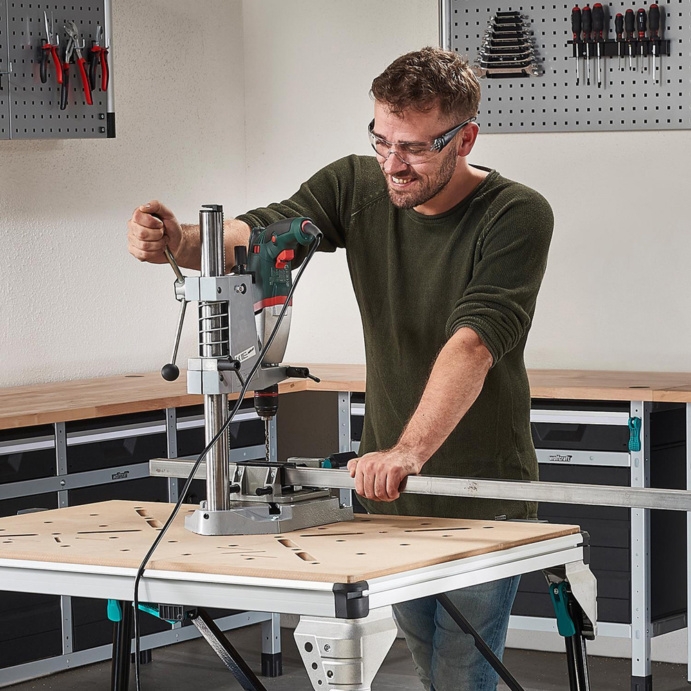 Bring precision and control to your drilling projects with the Wolfcraft Drill Stand, a must-have for any workshop aiming for accurate, safe, and stable drilling. Designed with a sturdy 40mm round column and a 420mm toothed rack, it ensures straight, twist-free drilling every time. The 43mm Euronorm collar makes it compatible with most standard power drills, while the depth stops with a quick adjuster and scale ring allow for millimetre-precise depth settings. Its rack-and-pinion drive offers smooth, adjustable height control, and the three-arm feed lever ensures comfortable, controlled lowering. A built-in return spring assists with lifting, and thoughtful extras like a cable holder and milled worktop with clamping grooves make setup and operation even easier. Whether you are working on wood, metal, or plastic, this die-cast aluminium stand delivers the stability and accuracy your projects deserve.