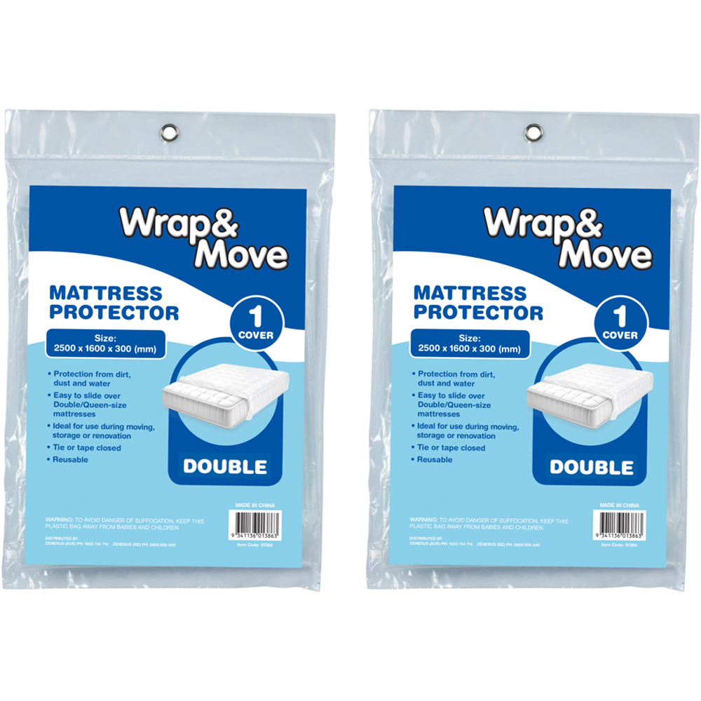 Ensure your mattresses remain pristine during moves, storage, or renovations with the Wrap & Move Mattress Protector. This two-pack offers a perfect solution for beds, safeguarding them against dirt, dust, insects, and water. Simply slide the protector over your mattress and secure it by tying or taping it shut, enjoying the ease of use and durability that allows for repeated use.