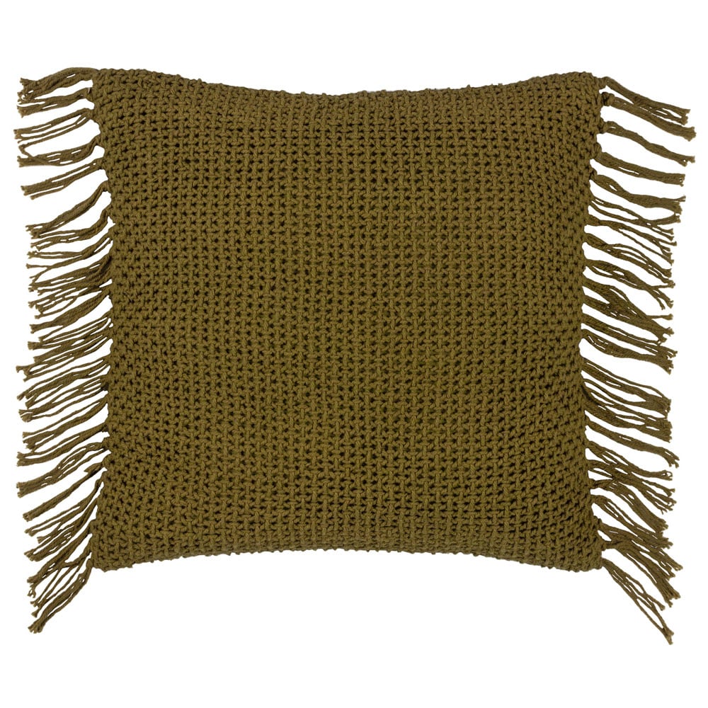 This knitted cushion brings natural style to your home with its earthy khaki tone. The all-over knit design is complemented by a durable cotton reverse, secured with a hidden zip. A double-sided tasselled fringe adds a touch of texture and visual interest. Crafted from super-soft 100% cotton, this versatile cushion is perfect for adding comfort and style to any room.