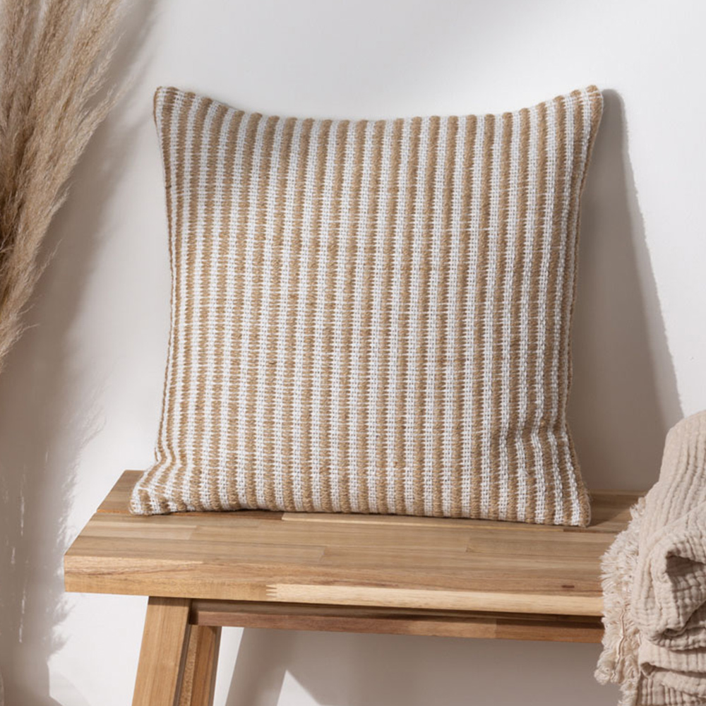 This nautical-striped woven cushion effortlessly blends natural textures with modern style. Its unique design features layers of sustainable jute interwoven with elegant cotton stitching, creating a captivating look. The natural jute and cotton blend (65% jute, 35% cotton) offers a pleasing contrast, while the plain cotton reverse adds versatility. Perfect for an effortless modern Scandi-neutral aesthetic, or for bringing the natural fibres of the outdoors in, this cushion is a simple yet striking addition to any home.