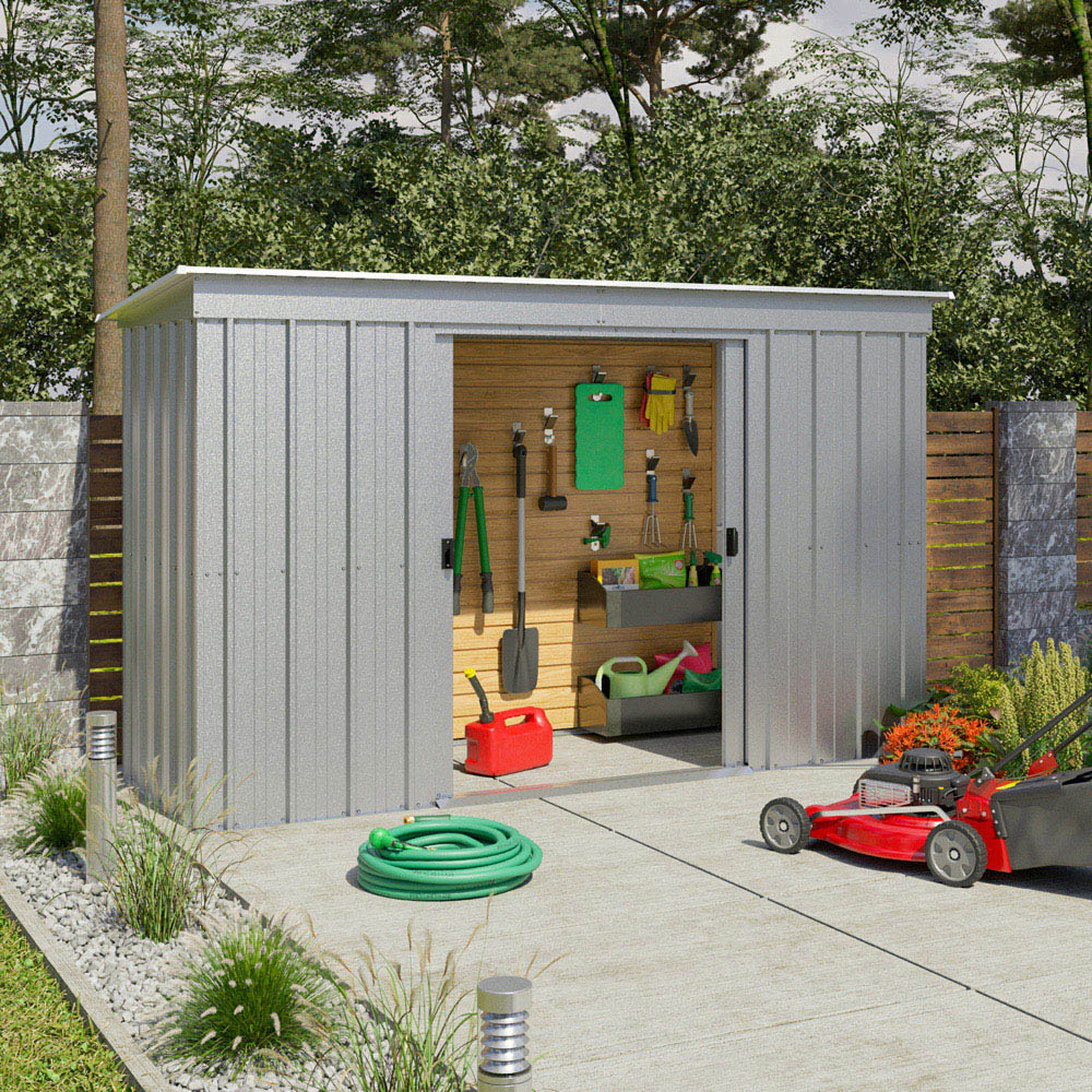 This robust 10 x 4ft pent roof metal shed offers secure, weatherproof storage for your outdoor equipment, such as bicycles and garden tools. Its 100% hot-dipped galvanised steel construction ensures a maintenance-free and fire-safe storage solution. A ten-year anti-rust warranty provides peace of mind, and anchor fixings are included.