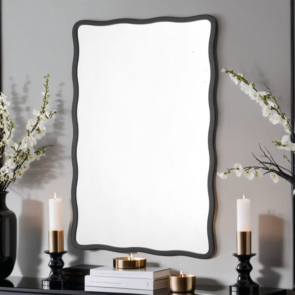 Elevate your space with this handcrafted British mirror. Its sophisticated black scalloped frame, meticulously crafted from wood with a wooden backing, adds a touch of elegance to any room. The mirror',s crisp, clear reflection brightens interiors, creating a light and airy atmosphere. For easy hanging, two loops are securely attached to the back. Please note: wall fixings are not included. A truly quality piece, made in the UK.