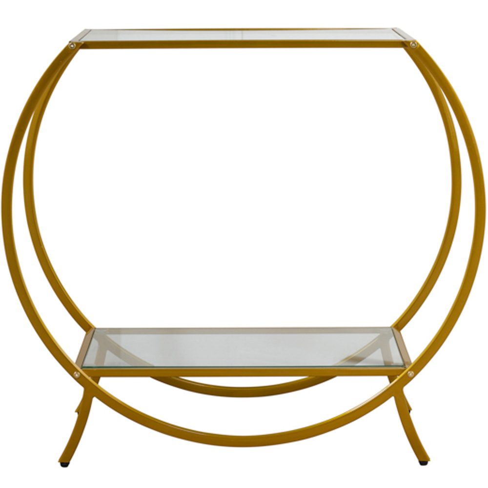 The Zenor console unit is where practical design meets elegant aesthetics, bringing a glamorous feel to any living space. The luxurious gold-effect metal finish and clear glass tops make the Zenor console table an exceptional addition to your home. The sturdy metal frame also makes this console table a practical choice. It can be used for a variety of functions, whether it be for displaying photos and ornaments or as a chic spot to arrange drinks when entertaining.
