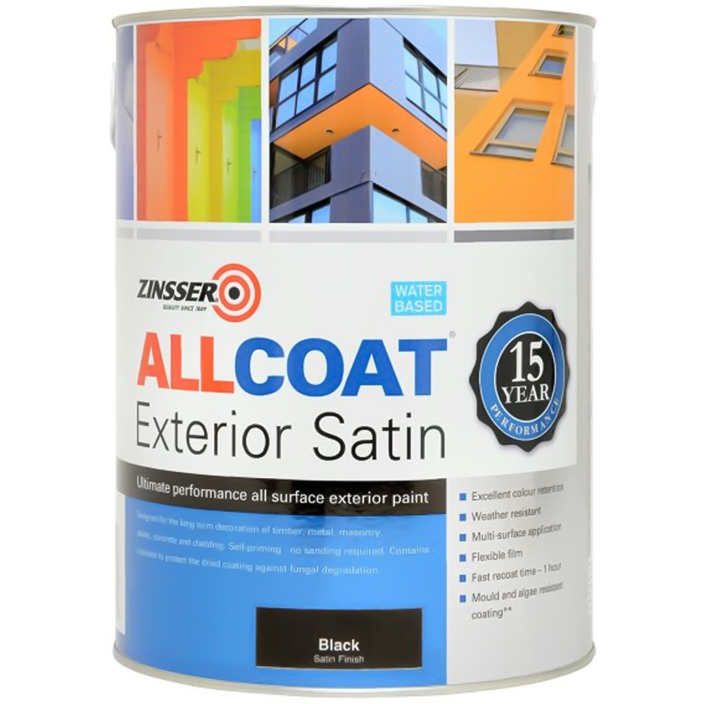 Achieve ultimate protection for your exterior surfaces with this superior, mould-resistant Zinsser Allcoat Black Water Based Exterior Satin Paint. Providing supreme defence against cracking, blistering, and flaking, its tough finish withstands rain and harsh weather, boasting excellent colour retention. This water-based formula ensures vapor permeability and a low-maintenance, water-shedding coat, recoatable in just one hour. Suitable for wood, metal, masonry, plastic, concrete, and cladding, it offers long-lasting beauty. A built-in biocide protects against fungal degradation. This satin finish paint, available in a 5L pack, will keep your exteriors looking bright and beautiful for years.
