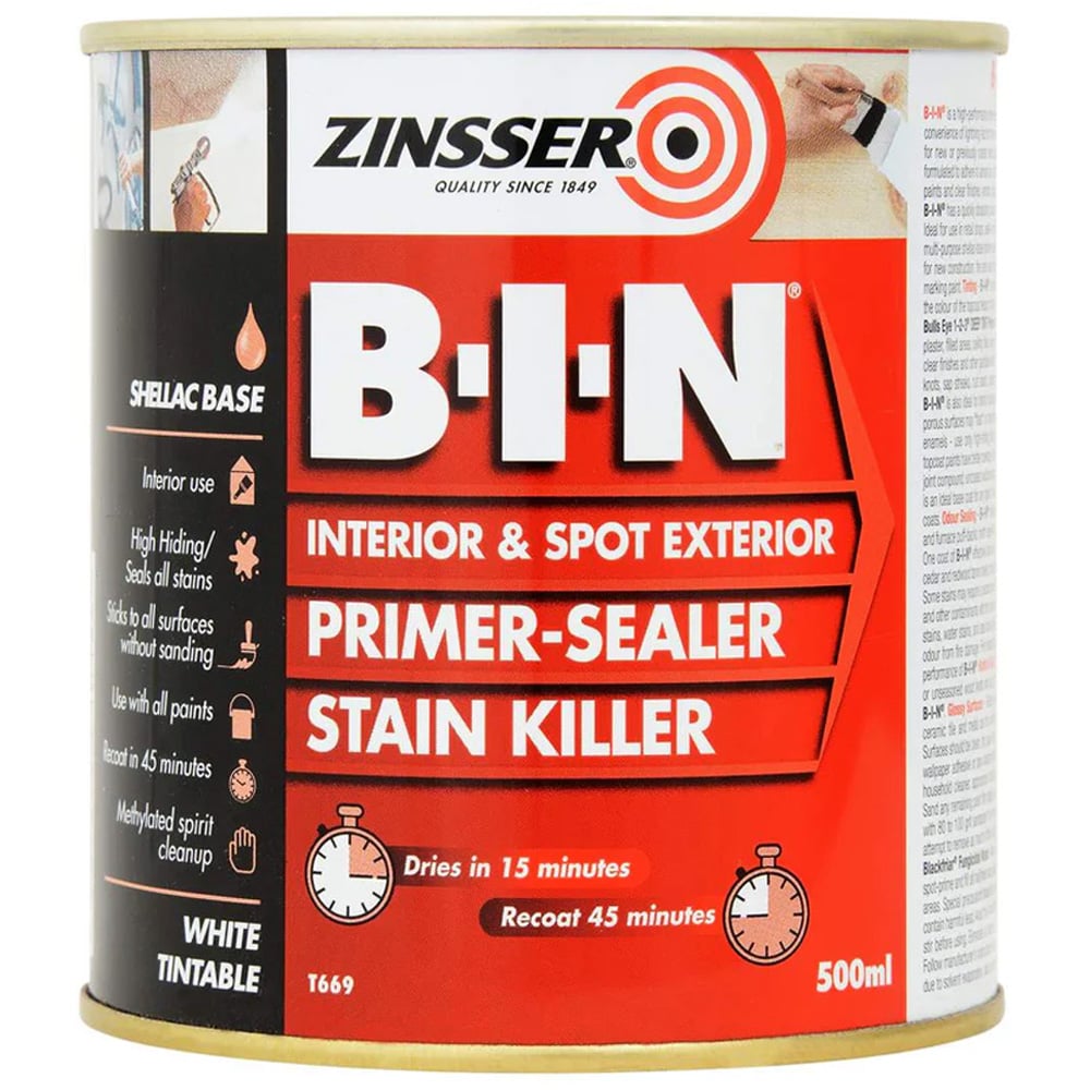 Refresh your surfaces with Zinsser Bin White Primer. This exceptional primer adheres flawlessly to even glossy surfaces like glass, eliminating the need for sanding. Ideal for interior walls, ceilings, and doors, and for spot priming exterior metal, trim, PVC, and wood, it effectively blocks tough stains, seals porous areas, and traps odours from smoke, fire damage, pets, and more. Available in a convenient 5L pack.